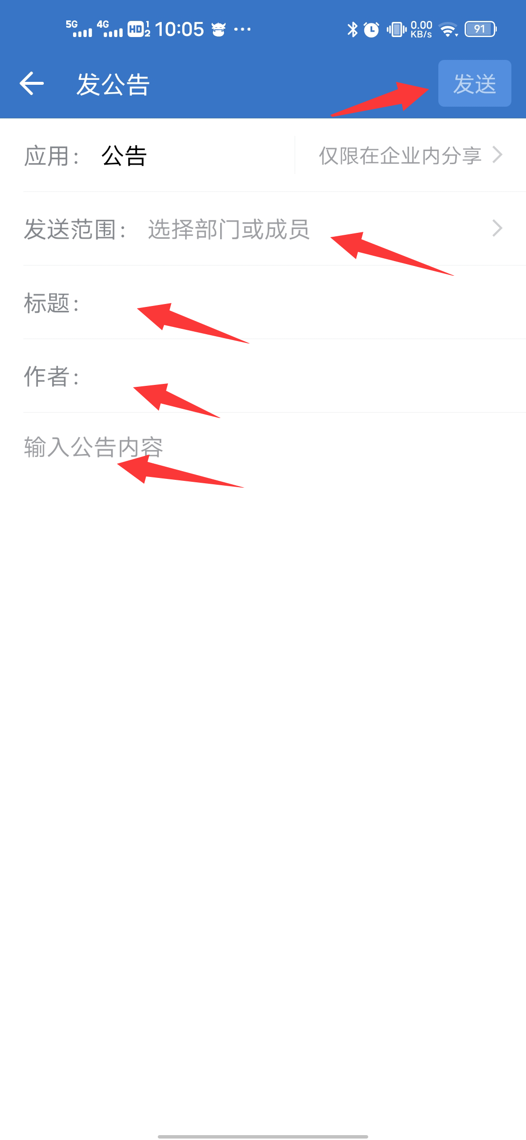 在下面发公告界面,填写好标题、作者、内容,注意选择范围,在通讯录中选择人员,通讯中前面是个人,拖到下方是部门。然后点右上方发送,完成发消息。