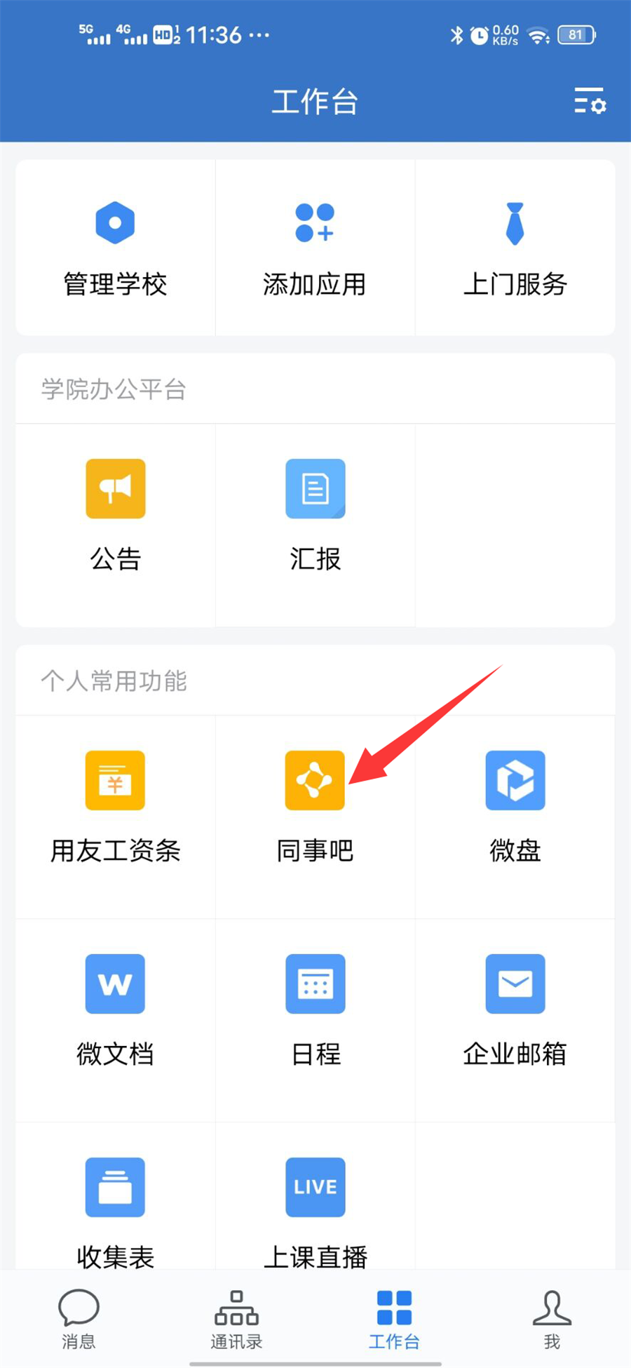 操作如下:电脑或手机进入企业微信,点下方“工作台”