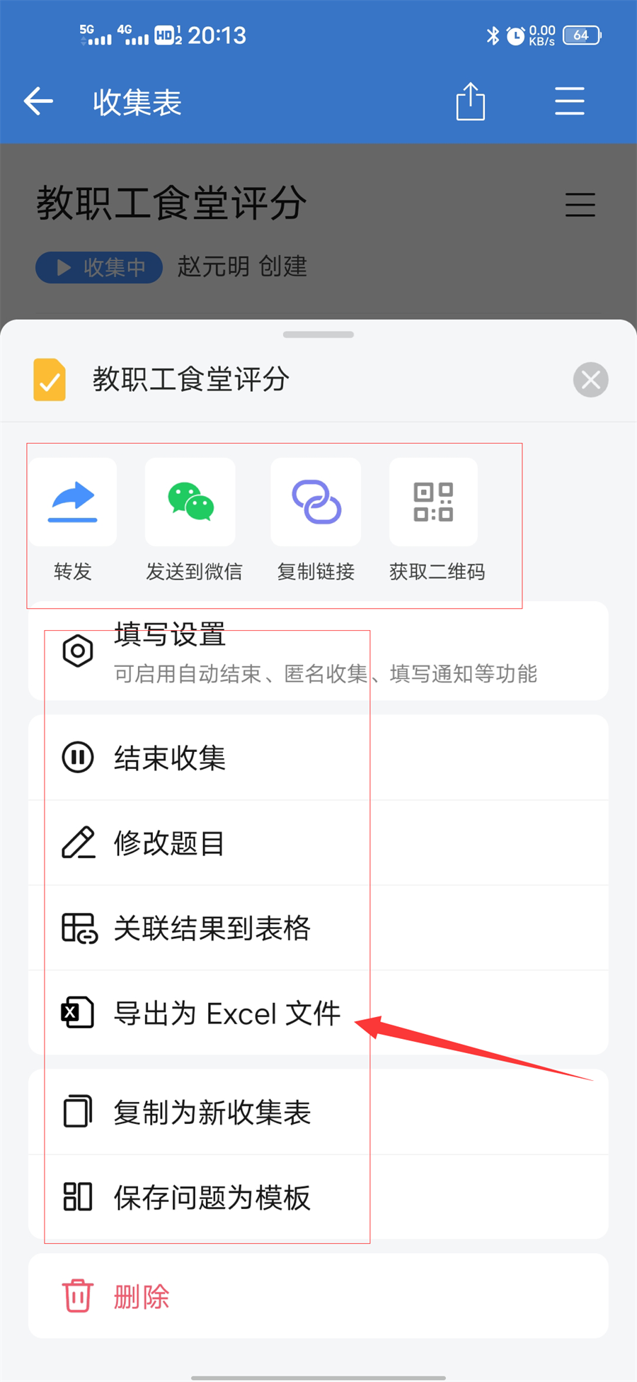 建好的收集表可以转发,可以将链接发消息,可以打印二维码,让大家现场扫描。最终的结果可以转为文件进行处理。