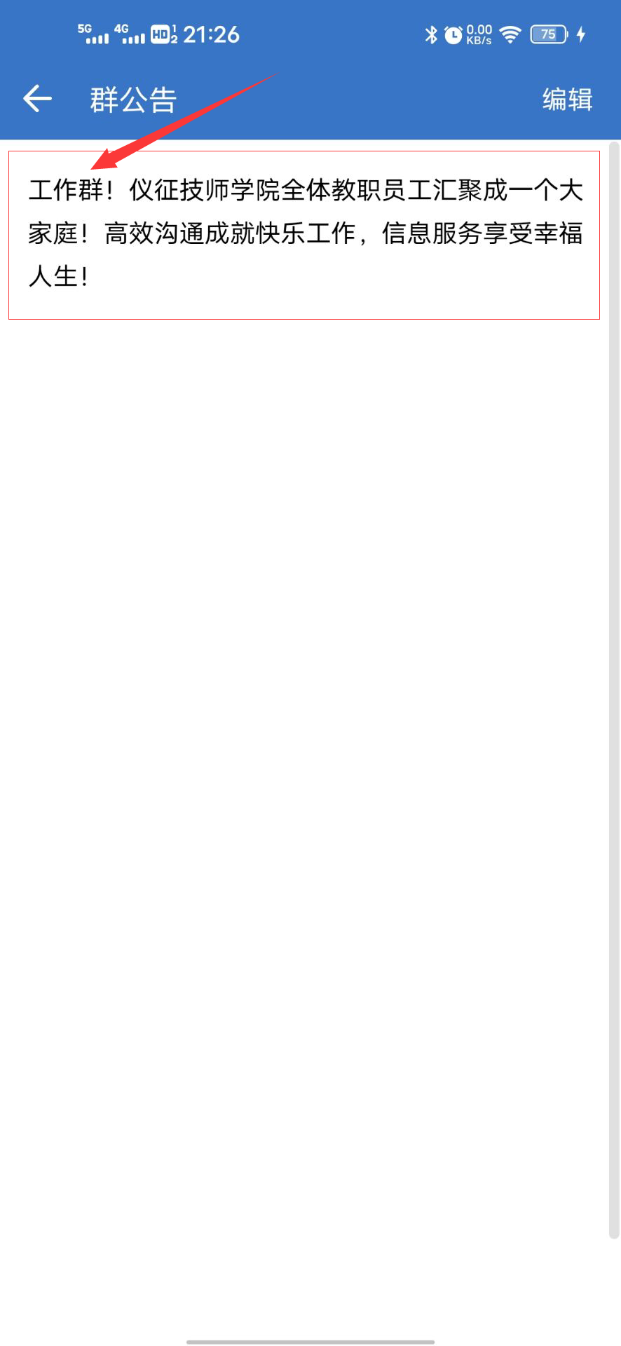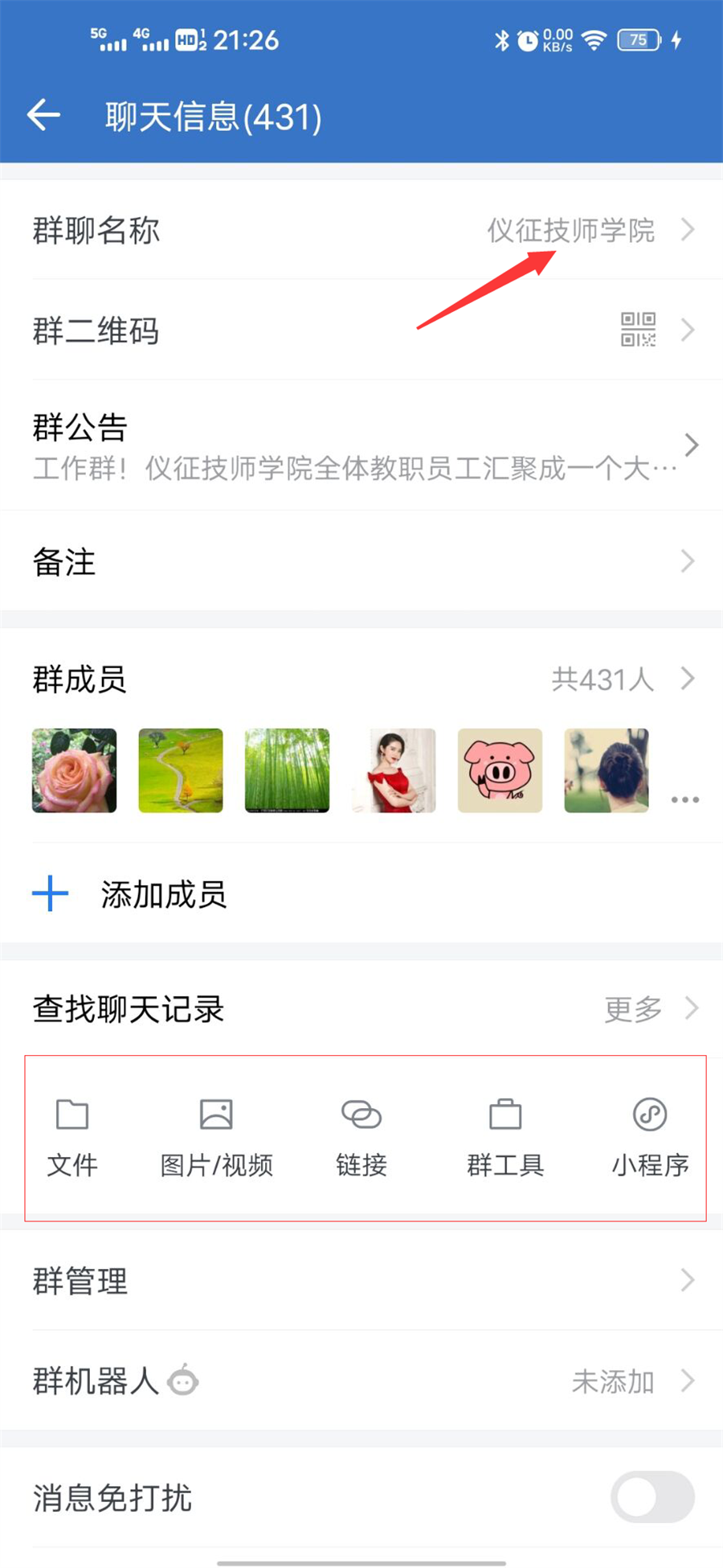 功能简要说明:所有群为工作群,主要只有一个“仪征技师学院”群,其它为部门或分管机构。