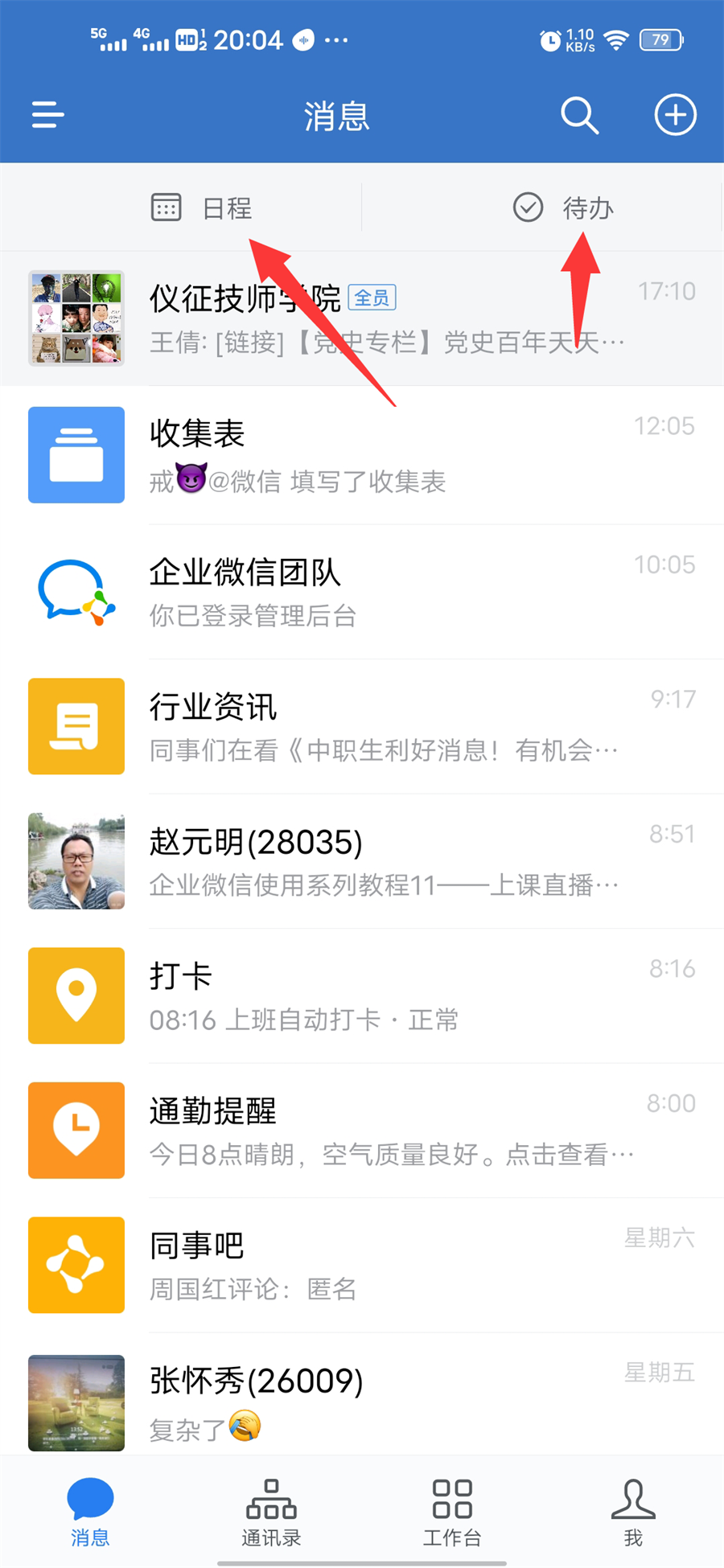 操作如下:进入 企业微信首页“消息”上方有“日程”或“待办”