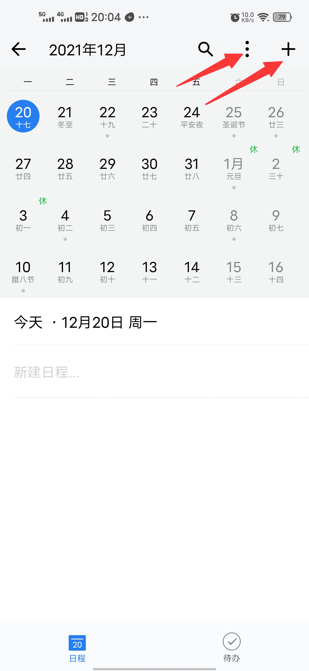 右上方点进去有查看设置和新建日程。