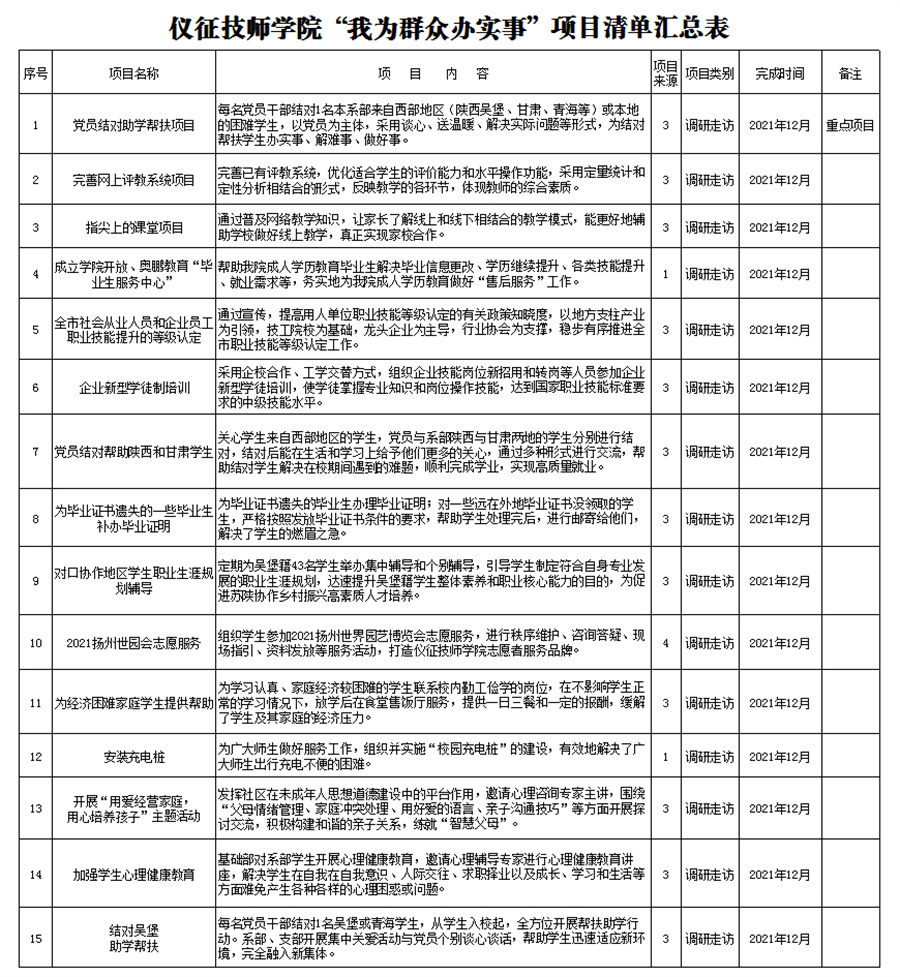 按照中央和省市委关于党史学习教育的安排部署,推动“我为群众办实事”实践活动见实见效,着力解决群众“急难愁盼”的突出问题,切实将学习成效体现在以人民为中心发展思想的生动实践中。学院确定了15项实事项目(含1项重点项目),现向社会进行公示,欢迎社会各界和广大人民群众予以监督。