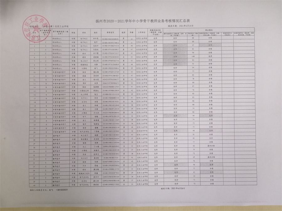 仪征工业学校2020-2021学年扬州市中小学骨干教师校内考核结果公示