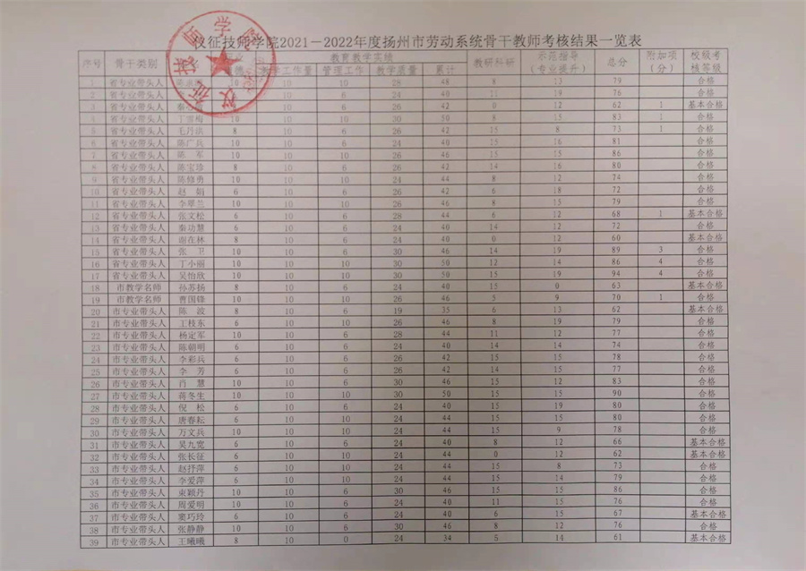 仪征技师学院2021-2022年度扬州市级劳动系统骨干教师业务考核结果公示