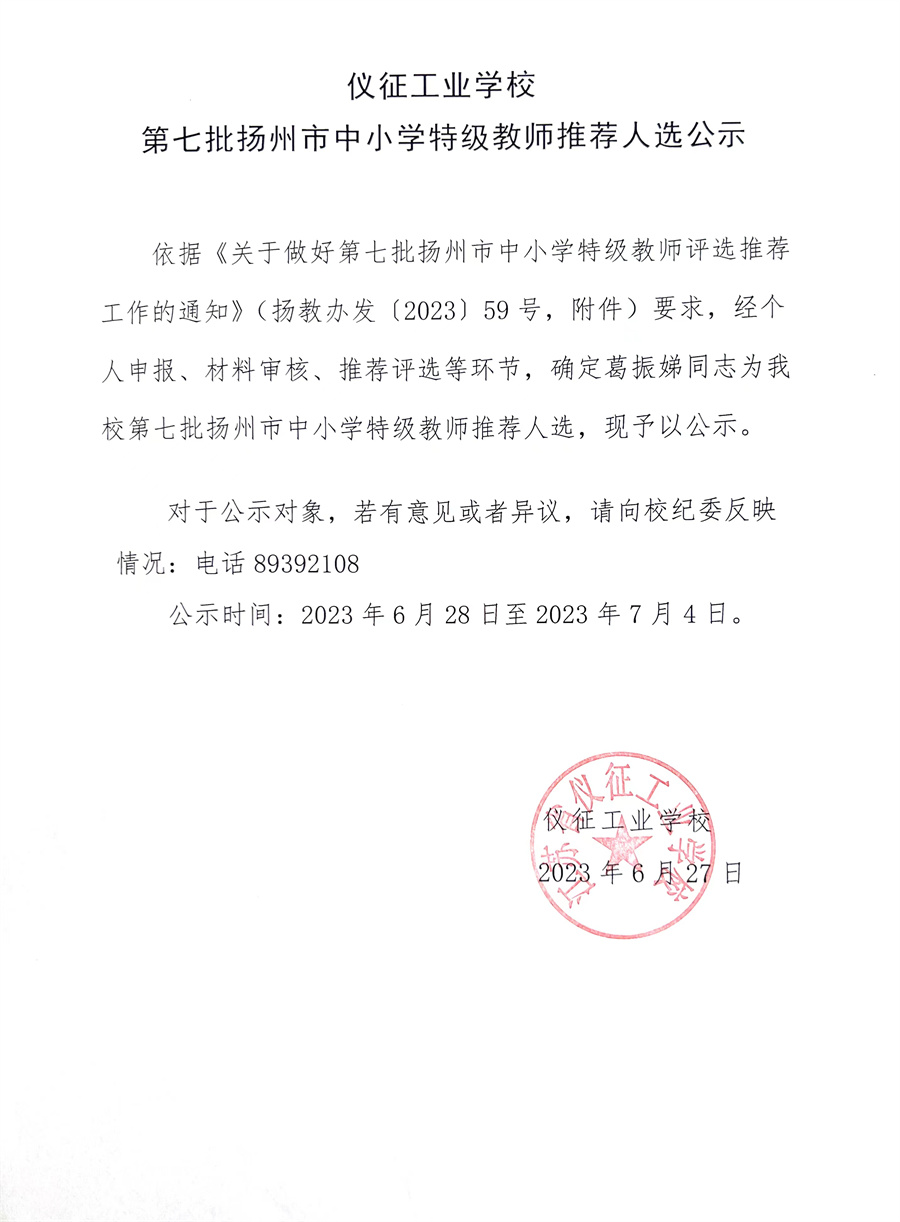 仪征工业学校第七批扬州市中小学特级教师推荐人选公示