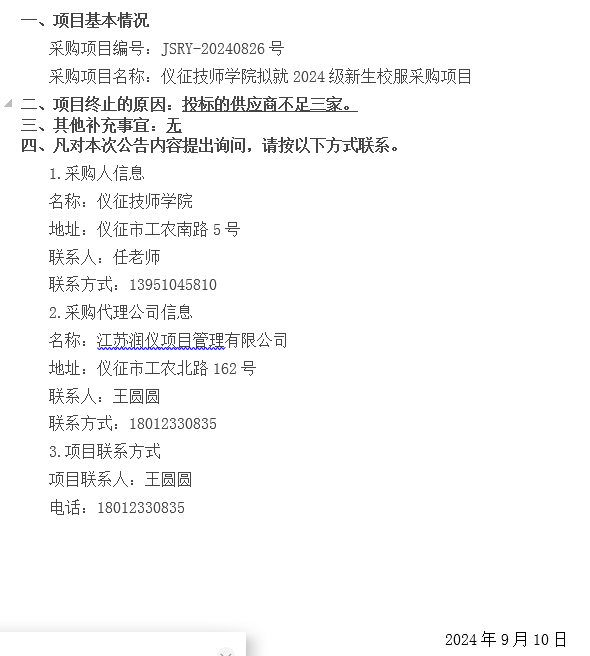 仪征技师学院拟就2024级新生校服采购项目终止公告