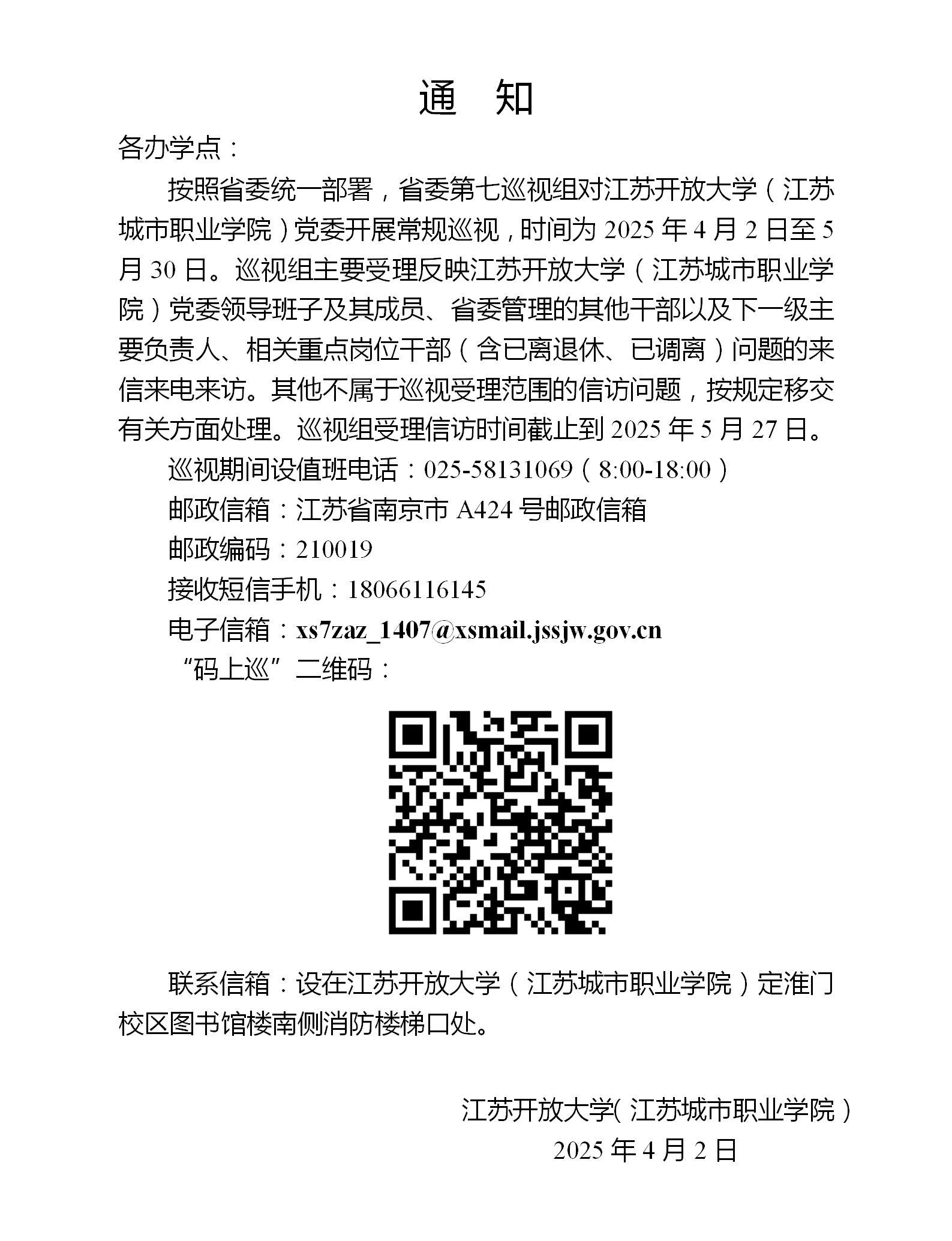 省委第七巡视组对江苏开放大学(江苏城市职业学院)党委开展常规巡视通知