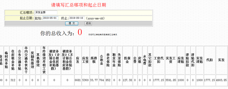 5、工资汇总:选择汇部时间段,点提交,然后用鼠标依次去点实发下面的那个单元格,得到总金额。