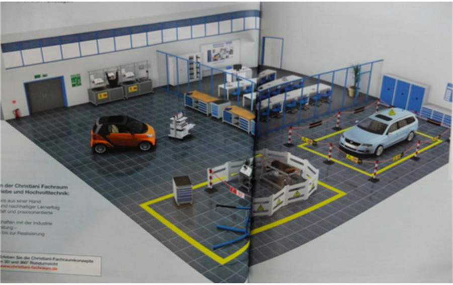 对于以行为为导向的课程体系中的操作和得到结果阶段需要我们有车间实验室来完成在实际车辆/系统上的检修操作。这里将只用于高压电车辆/系统的检修工作并且至少有两个举升机和摆放多辆汽车的空间以及用于存放器材和检测工具的仓储区域。这个车间实验室也用作考试认证中心。
