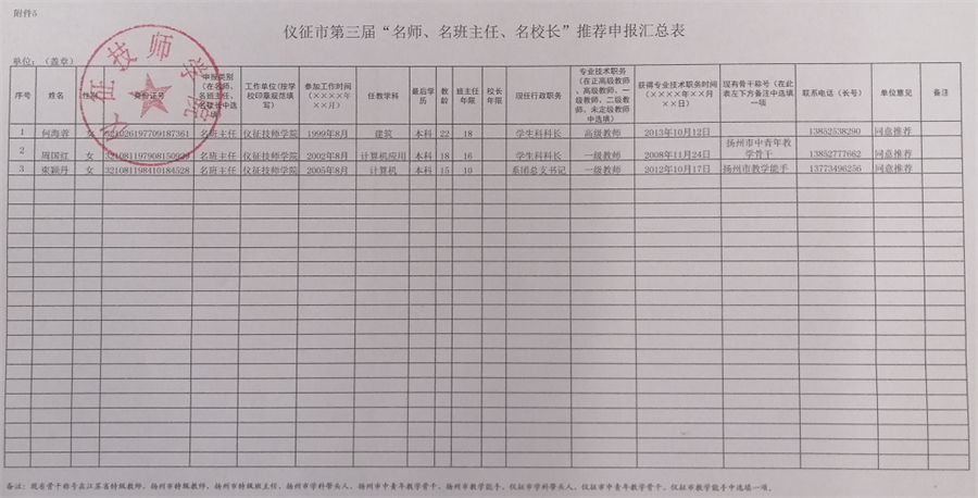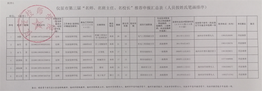 仪征技师学院仪征市第三届“三名工程”推荐人选校内公示
