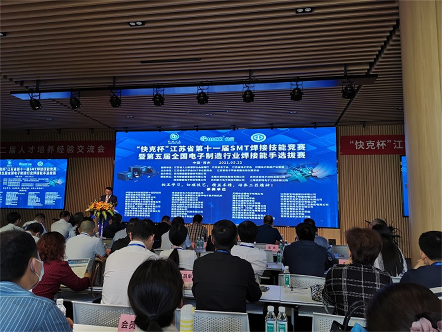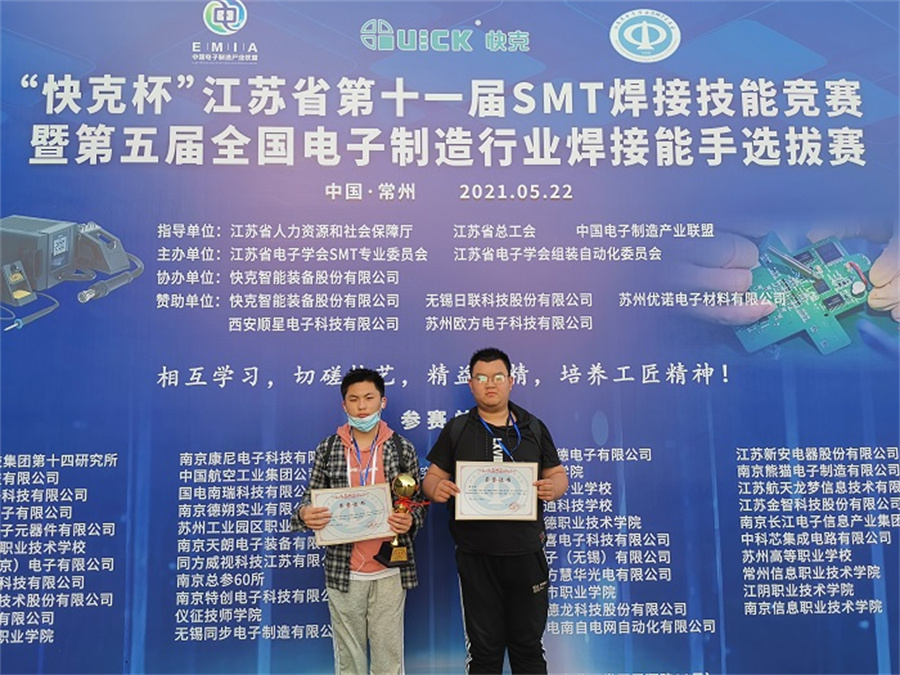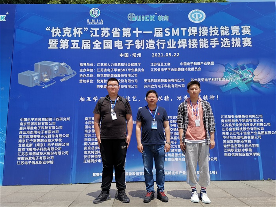 为展现江苏省电子信息产业发展水平,为行业和院校搭建合作交流平台,为职工和在校学生提供技艺切磋技艺的平台,增进电子产品制造过程中的品质意识,让“工匠精神”成为高质量发展的重要承载,更成为一股新风锐气与精神力量。2021年5月22日,江苏省电子学会SMT专业委员会联合江苏省人力资源和社会保障厅、江苏省总工会职工技术协会等部门在常州举办“快克杯”江苏省第十一届SMT焊接技能竞赛。我院电子信息系科创办景玉荣主任和张治豪、张文浩两名选手参加了此次竞赛活动。