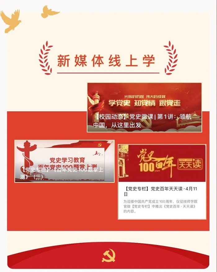 今年3月学院在官网、官微开设“党史专栏”,推送“百年党史100题掌上测”、 “党史微课” 、“党史百年天天读”等学习的内容,营造学习宣传党史的浓厚氛围。截至5月26日学院官微已发布党史学习教育信息149余篇,累计浏览量达119000余次。在学生中开展党史学习教育,通过举行升旗仪式、主题班会、团课、专题讲座、党史学习教育知识竞赛、红色经典诵读比赛、月塘文史馆红色教育基地实地参观等活动,累计面向1200名学生开展16场活动,宣传党史基本理论。同时启动学生学党史、感党恩、跟党走“七个一”主题教育活动,让红色精神厚植于青少年心中。