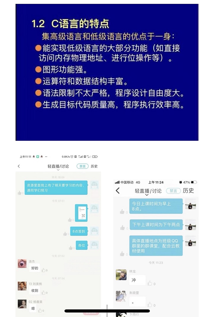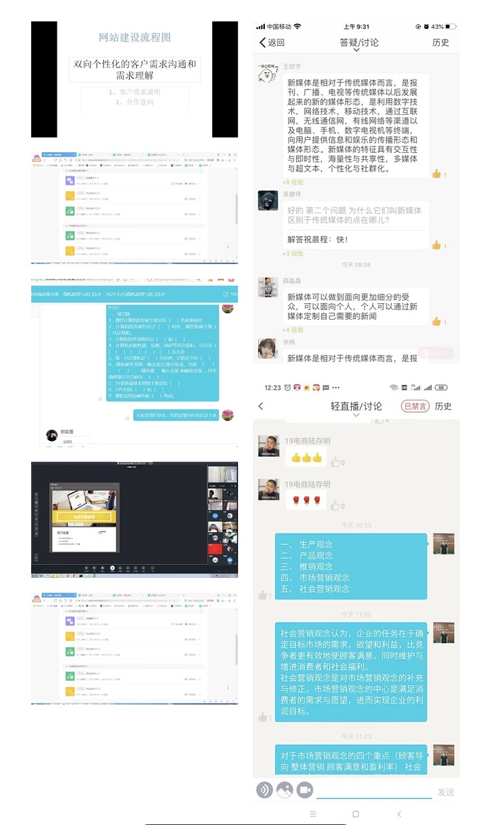 全体任课教师在确保授课质量的前提下,以云班课为主,辅以企业微信直播、QQ直播、钉钉直播等直播软件,形成了云班课预习、考勤、讨论、作业、测试加直播软件现场讲解的模式,有力提升了网络课堂的教学质量和效率。