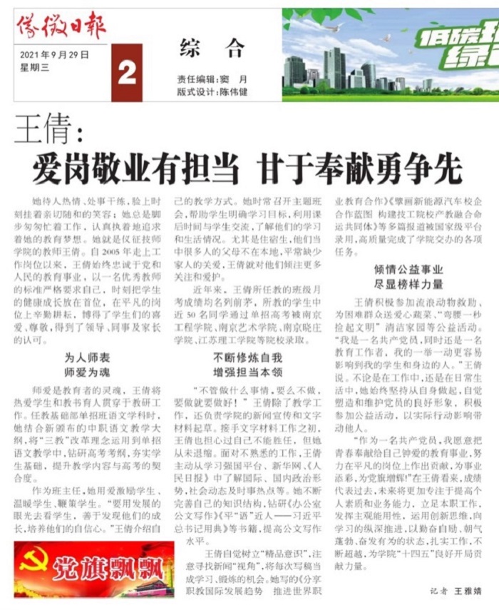 她待人热情、处事干练,脸上时刻挂着亲切随和的笑容;她总是脚步匆匆忙着工作,认真执着地追求着她的教育梦想。她就是仪征技师学院的教师王倩。自2005年走上工作岗位以来,王倩始终忠诚于党和人民的教育事业,以一名优秀教师的标准严格要求自己,时刻把学生的健康成长放在首位,在平凡的岗位上辛勤耕耘,博得了学生们的喜爱、尊敬,得到了领导、同事及家长的认可。