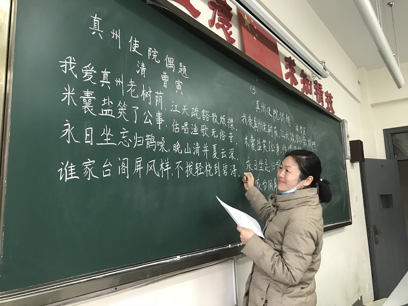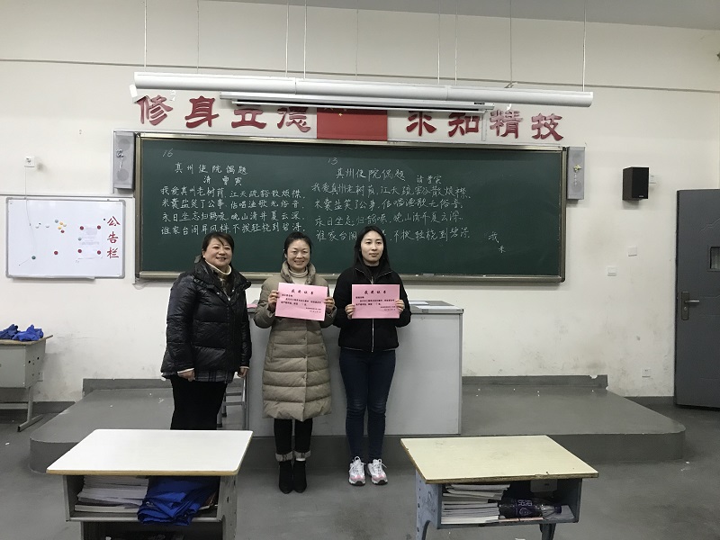 决赛于12月2日在教学楼D栋302进行。现场,由学院督导室王莉主任、教研室葛振娣主任和系办公室“书法大师”李为国老师组成评委团,参赛选手临场抽签,6人一组,只写序号,裁判先回避再进行盲选打分,公平公正。参赛选手依次登台展示自己的粉笔板书功力,书写内容为清代名臣曹寅的《真州使院偶题》。经过激烈的角逐,刘从香、陈婧两位老师夺得大赛一等奖,常飞、李彩兵、杨定军、郭颖、罗艾琳、赵婷婷六位老师荣获二等奖,任国庆、李乡伟、王枝东、朱慧、丁春玲、张霞、糜年艳、王曦曦、鞠天宇九位老师获得三等奖。汽车工程系陈宝珍主任为获奖选手颁发了荣誉证书。