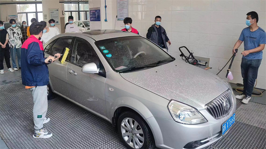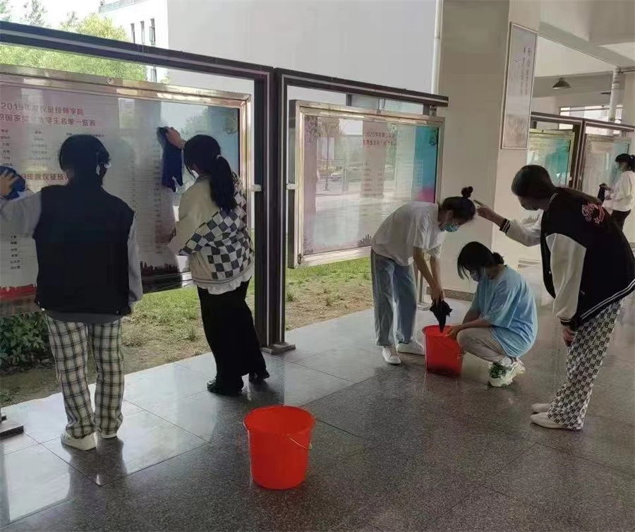 结合各个系部实际情况,学工处和系部学生科的老师组织同学们进行了形式多样的劳动实践。L楼汽车实训室,汽车工程系的同学们开展洗车活动,他们动作十分娴熟仔细,冲水、上泡沫、擦洗、再冲水、擦干、吸尘,整个洗车程序分工明确,有条不紊。校园长廊橱窗前,现代服务管理系和机电工程系的同学一同擦洗校园橱窗,他们三人一组,有的负责打水,有的负责用抹布除尘,有的负责用刀片小心翼翼地刮去贴附在玻璃上的污迹,对学校长廊中的宣传橱窗进行着360°全方位、无死角清洁。学生宿舍楼周边及操场上,电子信息系、电气工程系和基础部的同学们戴着一次性手套,拎着垃圾篓捡拾垃圾,他们不怕脏、不怕累,到每个角落认真清理垃圾,有的用长柄夹搛,有的弯着腰用手捡……劳动的身影在初夏暖阳下的校园里穿梭。