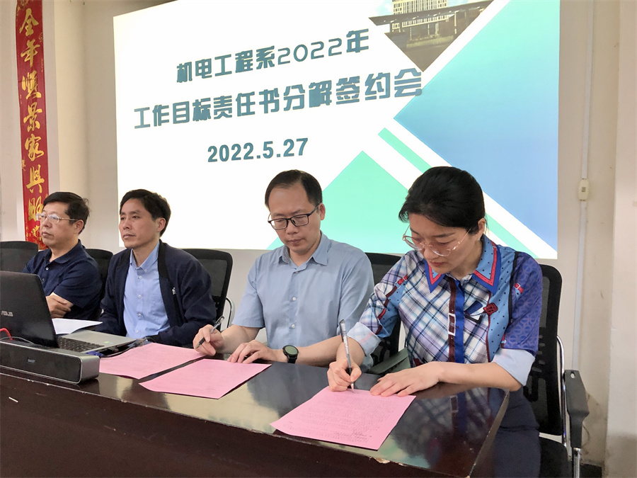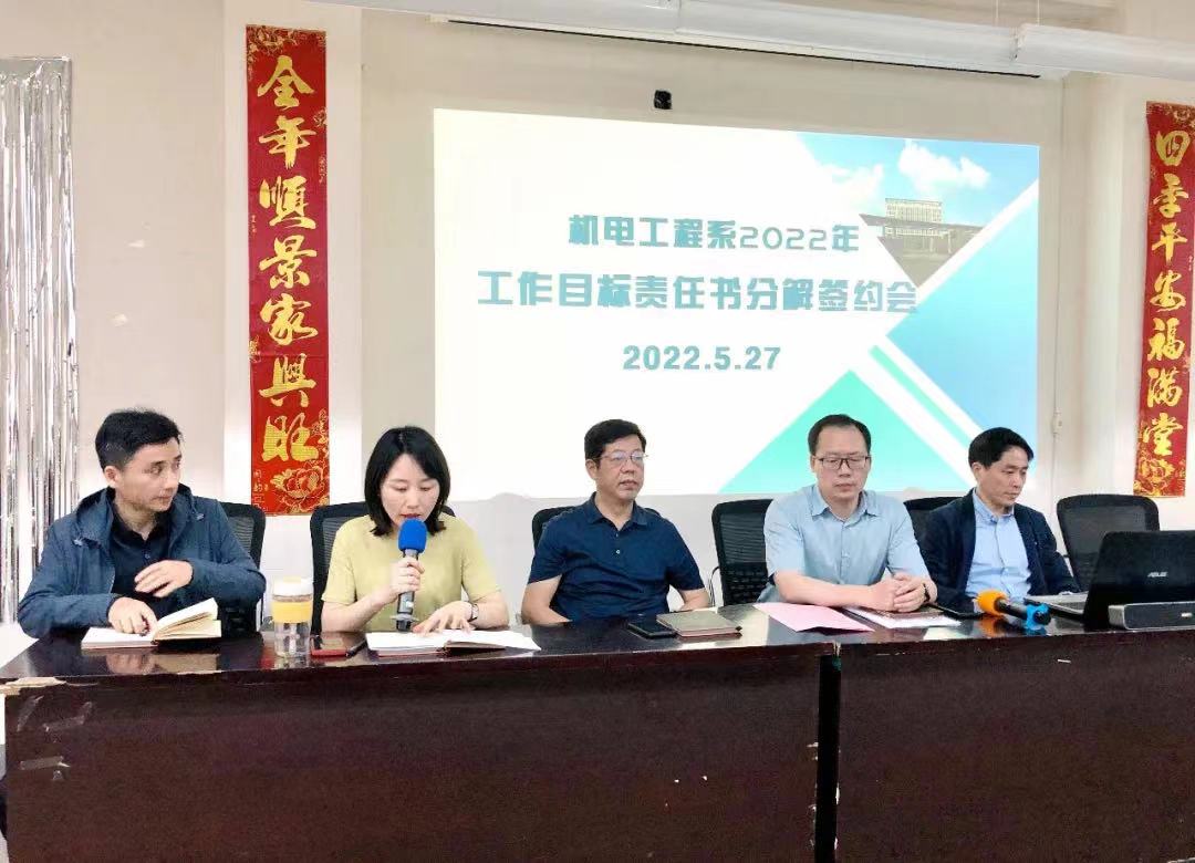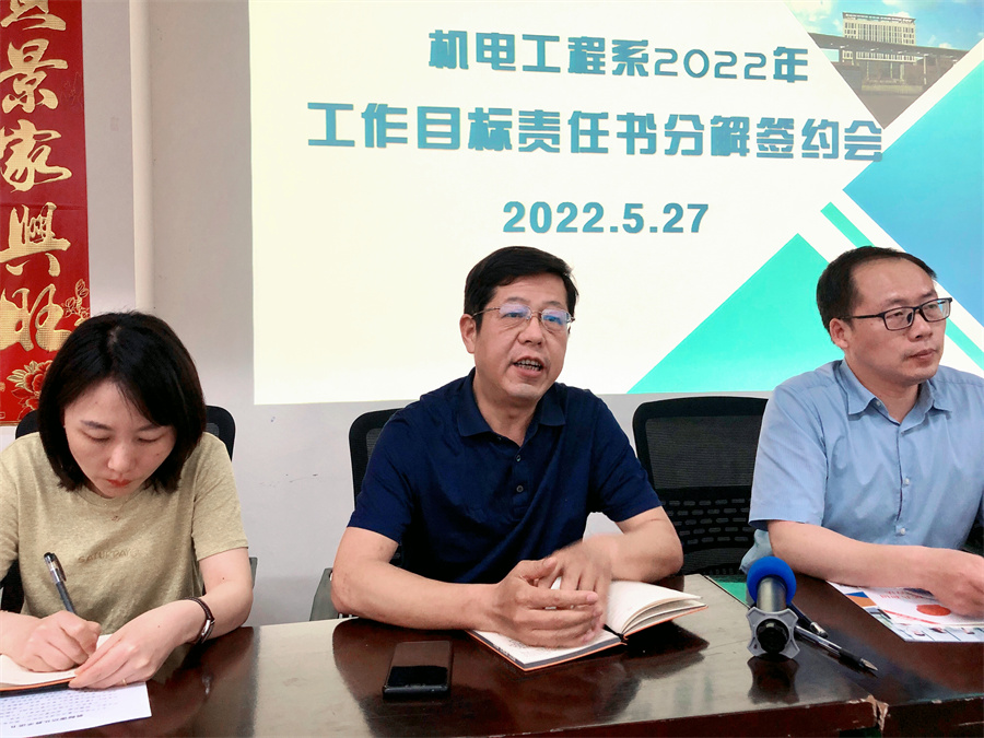 首先,赵娟书记宣读了机电系2021年度先进科室表彰决定,并进行了颁奖。继而,系办公室主任向全系教师宣读了系部2022年工作目标责任书,孙苏扬主任代表我系与系各科室负责人签订了2022年《工作目标责任承包书》。随后,陈隶源副主任对系部招生工作进展了安排。