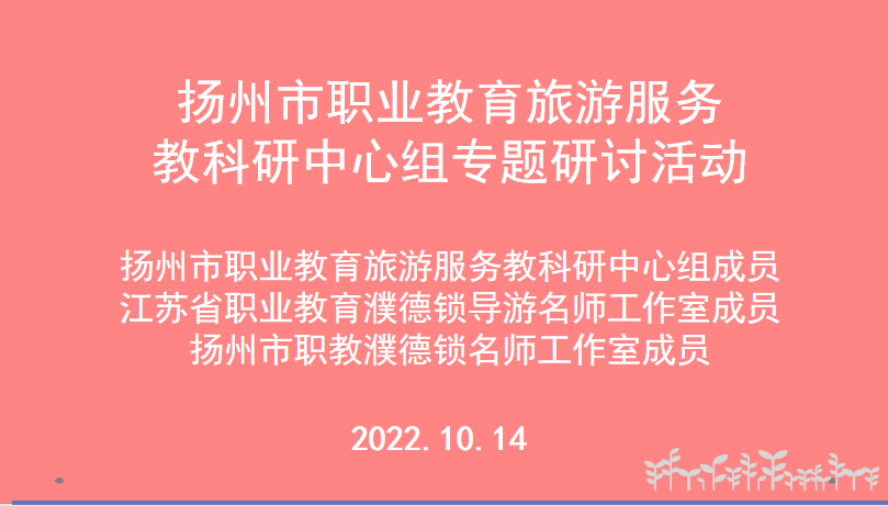 为做好2020级学生参加省中职学业水平考试复习工作,持续推进全市职业学校课堂教学改革,在旅游大类专业中深入开展课堂实践探索,着力提升教学质量,根据市教科院职教教研室的要求,经研究决定,扬州市职业教育旅游服务教科研中心组研讨活动于2022年10月14日在仪征技师学院开展。因疫情原因,此次教研活动改为线上举行。