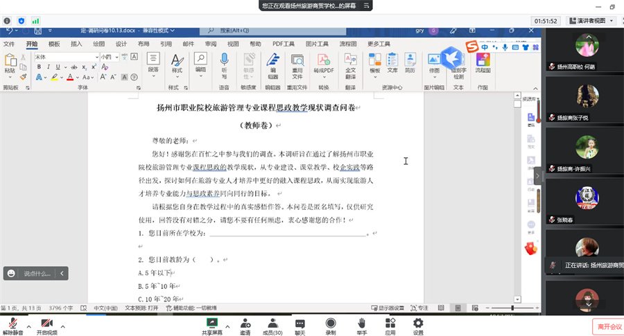 扬州旅游商贸学校郭伟老师发放省第五期教改课题的相关调研问卷。