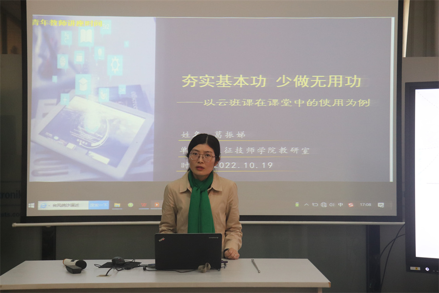 葛振娣老师以《夯实基本功,少做无用功》为题,结合自身丰富的教学实践经验,从“问题提出”、“案例分析”、“我的思考”三个方面,介绍了云班课在课堂中的使用技巧和具体实施要求,并现场解答了青年教师在云班课中遇到的困惑。