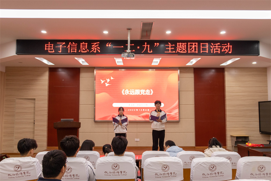 12月8日下午,电子信息系团总支在B208报告厅举行了“砥砺奋进新时代,青春礼赞二十大”主题团日活动,在团总支书记束颖丹的带领下开展了“举团旗、学团章、唱团歌、戴团徽”活动。系部团员们朗诵了《永远跟党走》和《礼赞二十大》来纪念“一二•九”运动,弘扬伟大建党精神,最后由电子信息系党支部书记宰倩倩以“学习贯彻党的二十大精神,奋力谱写新时代绚丽华章”为主题带领全体团员认真学习了党的二十大重要精神。