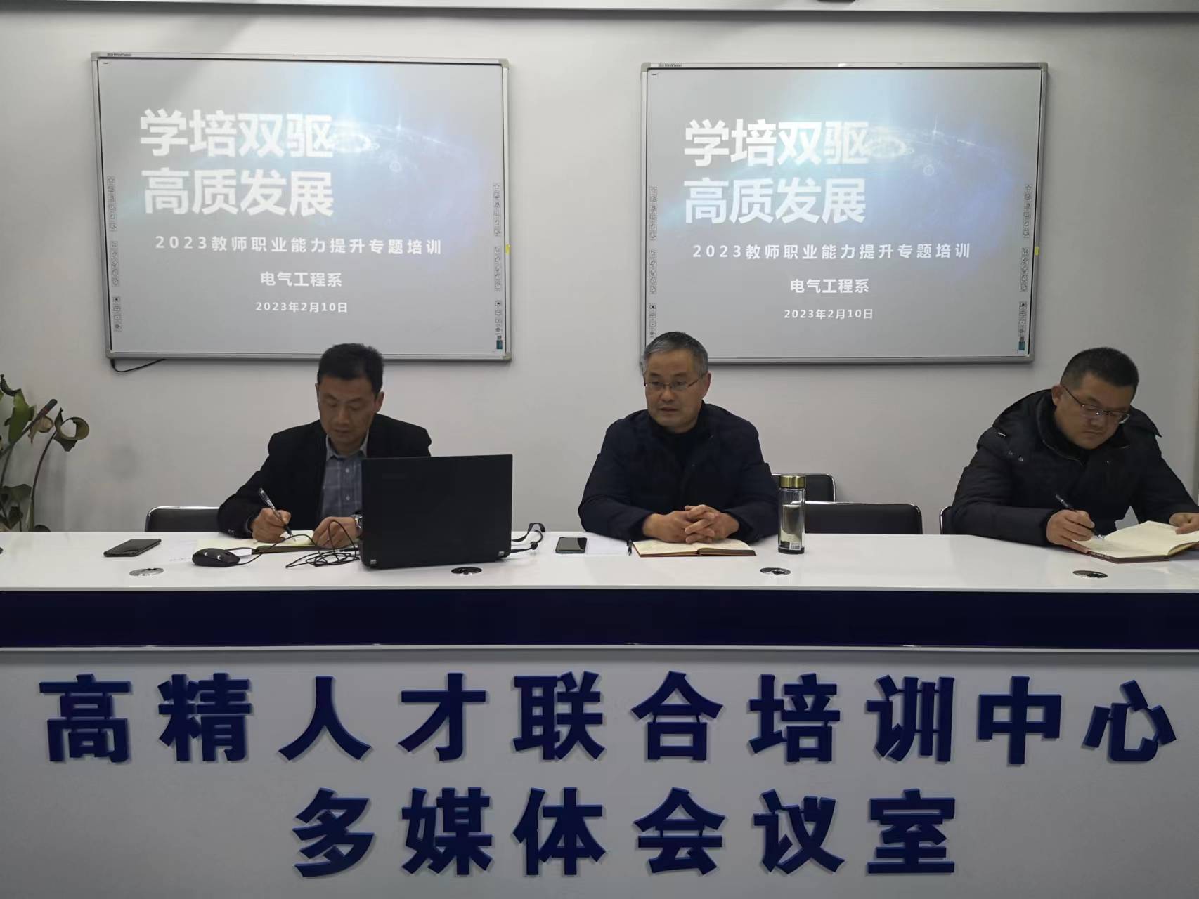 电气系主任张友林总结2022年系部取得的特色和亮点工作,围绕“学培双驱”张主任提出了2023年工作重点:一是提升“人才”驱动力,拓展教师企业实践+产学研途径;二是提升“人才”创新力,探索“研创+项目化” 新路径;三是深化产教融合,探索“无人机+、机器人+”专业发展新模式。以重点工作为立足点,在谋求系部发展的同时,张友林主任做《学培双驱 高质发展——2023教师职业能力提升》专题培训。