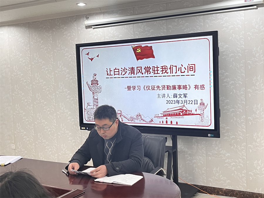 此次活动共有六个流程。首先,薛文军同志作为本次党课主讲人,以“让白沙清风常驻我们心间”为党课主题分享了关于学习《白沙清风:仪征先贤勤廉事略》的感想。薛文军同志将仪征历史上文化名人的经典事例和家风故事作为切入点,结合二十大对中职教育的提出的相关建议,以我校实际教学情况为标准,对党员教师提出相关要求。希望党员教师能坚持立德树人,坚持以习近平新时代中国特色社会主义思想铸魂育人,奋力培养更多高技能人才,为学院高质量发展贡献力量。