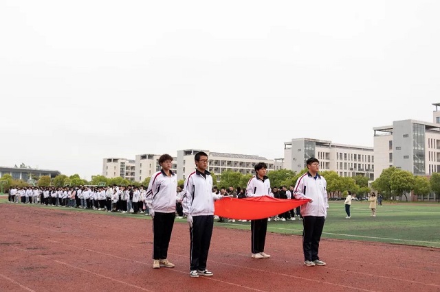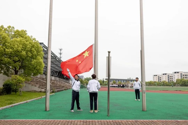 英姿飒爽的国旗班队员迈着铿锵的步伐,护送鲜艳的五星红旗来到国旗台下,伴随庄严雄壮的中华人民共和国国歌,在全体师生的注目中,五星红旗冉冉升起,迎风飘扬。
