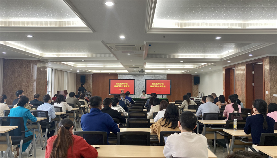 5月22日下午,仪征技师学院在图文信息楼九楼电教室举行新闻写作专题讲座,各部门负责人、支部书记、团总支书记,各部门通讯员、负责文字材料人员,妇联、关工委、党员、教师和学生代表参加活动。讲座由仪征技师学院副院长赵海燕主持。