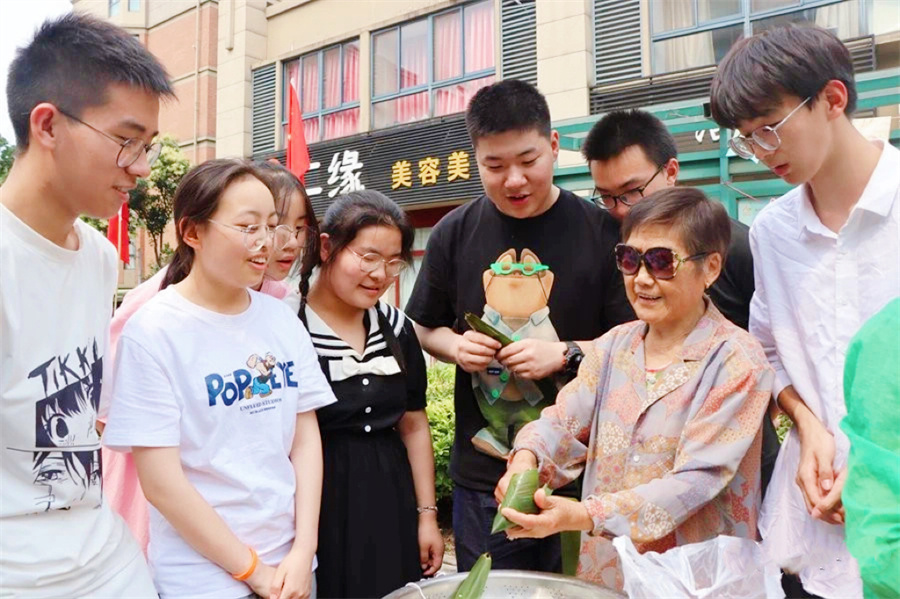 社区79岁老党员、居民小组长钱桂珍老奶奶一边做示范,一边讲述包粽子的技巧,卷粽叶、放糯米、裹粽叶、扎粽子,大家兴致勃勃地学习。在专业人员的指导下,同学们学习制作香囊,了解各种草药功效。看着自己亲手包出的粽子和精心制作的香囊,同学们体验了动手的快乐,感受劳动的乐趣。