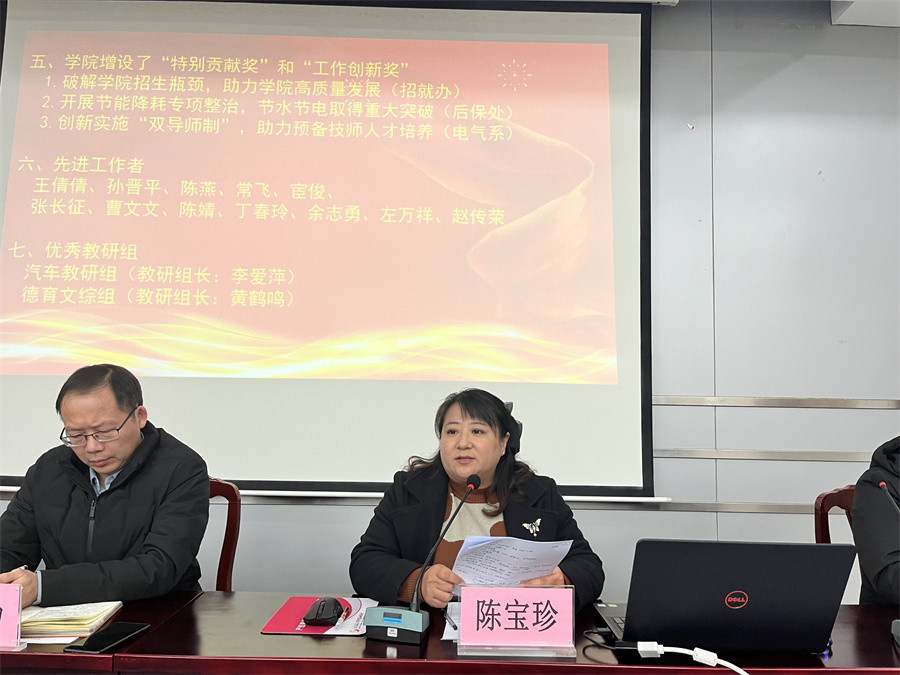 系部主任陈宝珍对系部2023年度的各项工作进行了总结,对年底获得表彰的同志表示祝贺。指导各位教师关注个人在系部及学院的贡献度,跟随学院发展的脚步,同步成长。新学期到来,希望各位老师提高精气神,做好个人规划,肩上有担子,心中有责任,实现新跨越,成为德技双馨的汽车人。