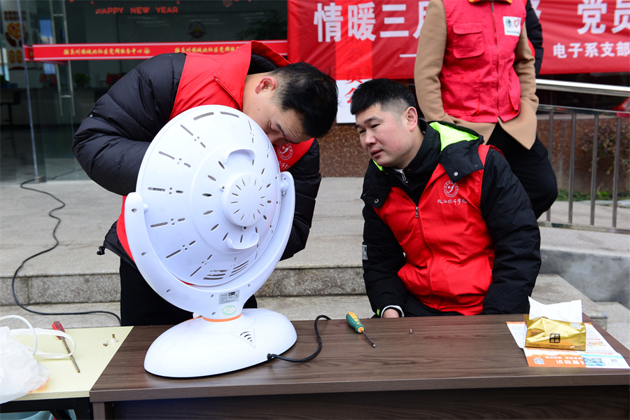 活动现场,党员志愿者们为社区居民免费维修家电。社区居民们纷纷拿着自家需要维修的热水壶、微波炉、电暖器等前来检修,志愿者们耐心询问家电损坏情况,仔细排查故障原因,更换损坏元件。维修的同时,向居民们科普日常家电维护小常识及安全用电知识。