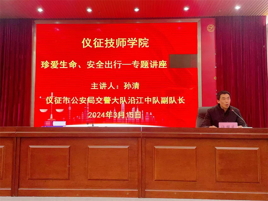为加强学生交通安全意识,提升学生文明素养,3月15日下午,仪征技师学院在图文信息楼十楼报告厅举行交通安全宣传讲座,讲座由仪征市公安局交警大队沿江中队副队长孙清主讲,300余名学生认真聆听,学生工作处处长任国庆主持讲座。