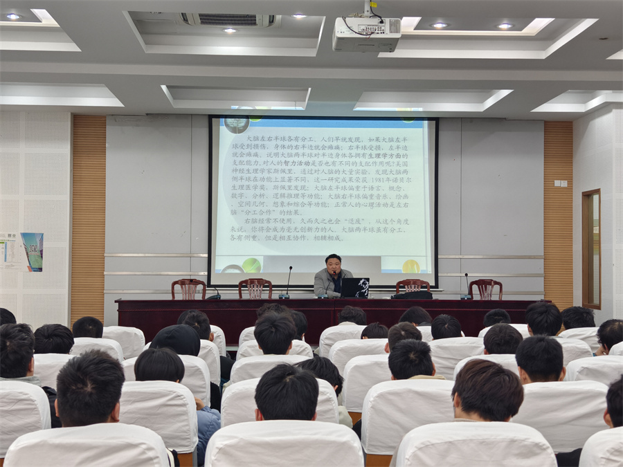 王枝东副主任以故事引入,激发同学们的创新兴趣,通过“不同选择的不同结果”,深入浅出地讲解了创新教育的重要性及必要性。同时,王主任还带领大家学习大脑的结构及功能分区,让同学们明白了左右脑的开发和利用程度决定了学习工作效率,每个人都有创新能力,现场很多学生都迸发出创新火花。