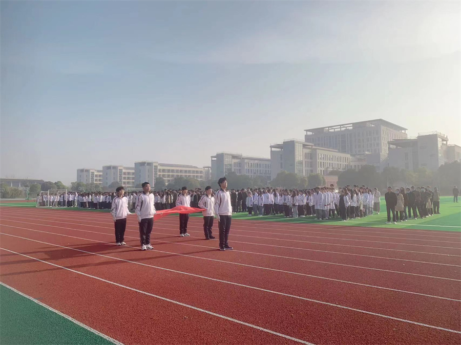 国旗护卫队迈着铿锵有力,整齐矫健的步伐,护卫着国旗行进至升旗台。在激昂雄壮的《义勇军进行曲》中,护旗手振臂一挥,鲜艳的五星红旗迎着朝阳冉冉升起,全体师生行注目礼,全场气氛庄严肃穆。