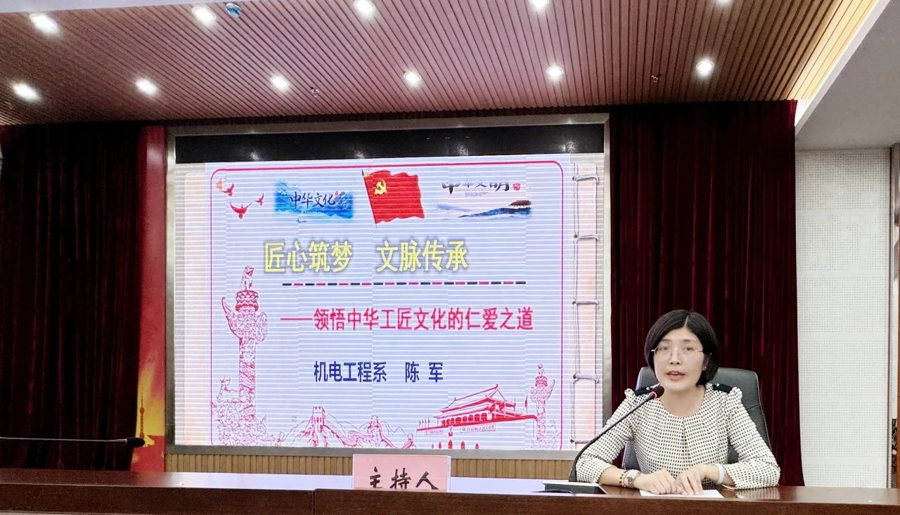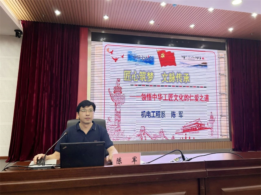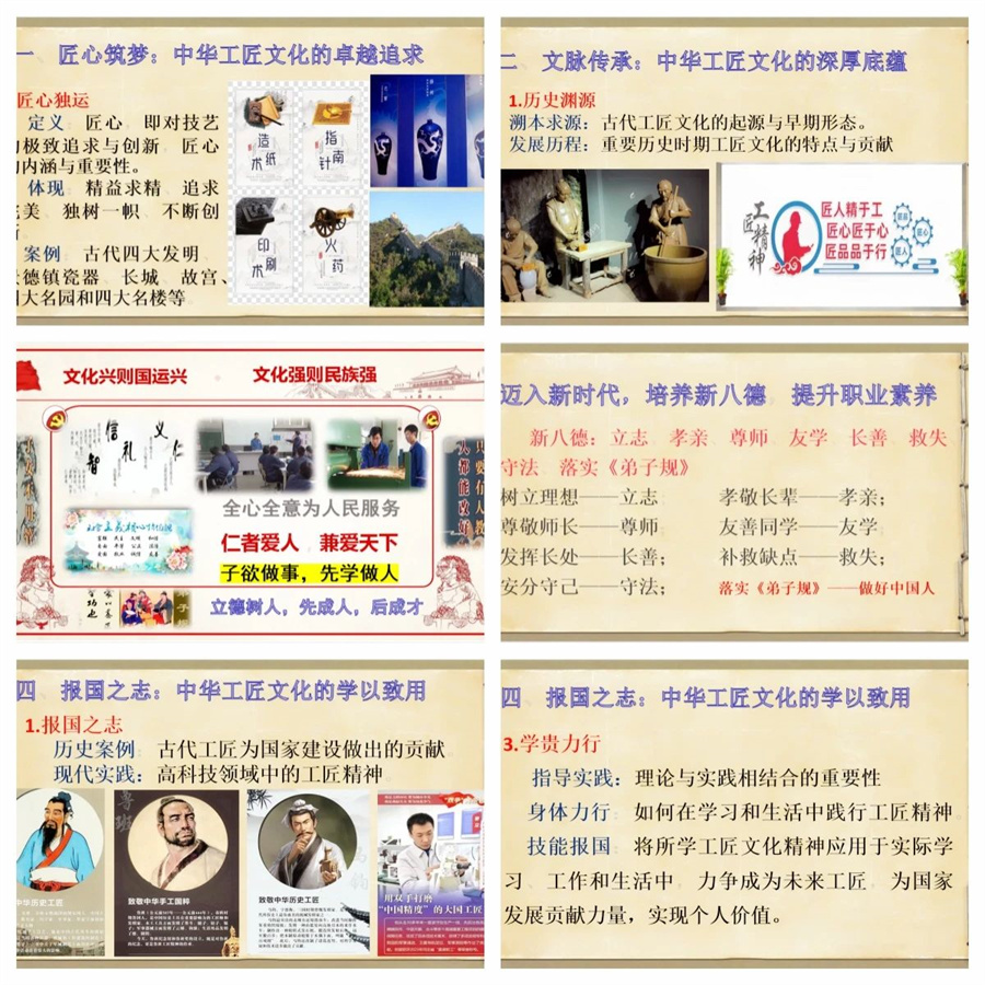 讲座中,陈军老师围绕“匠心筑梦”“文脉传承”“仁爱之道”“报国之志”四个方面展开,运用大量的史料、图文和视频,强调了中华工匠文化的重要性与现实价值,让师生深入了解中华工匠文化的深厚底蕴、丰富内涵以及在现代社会中的生动实践,营造了传匠心、强技能、同创造的良好氛围。