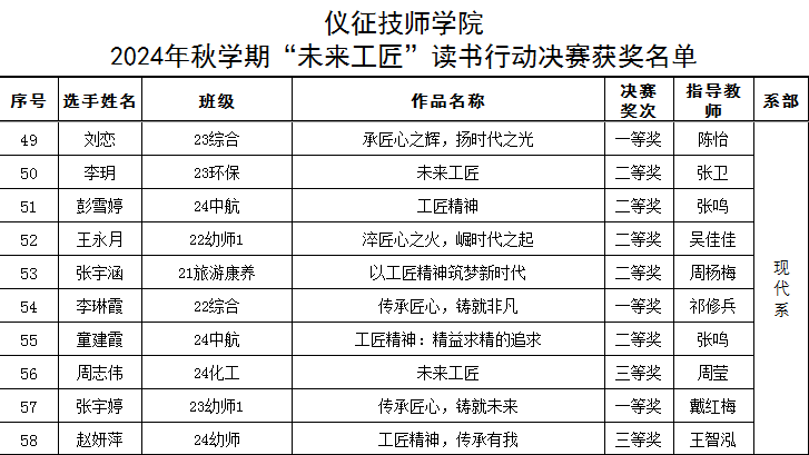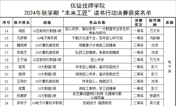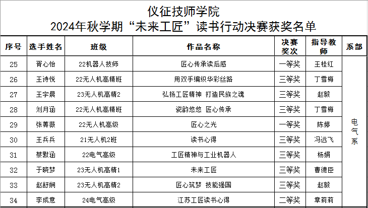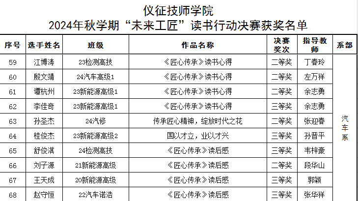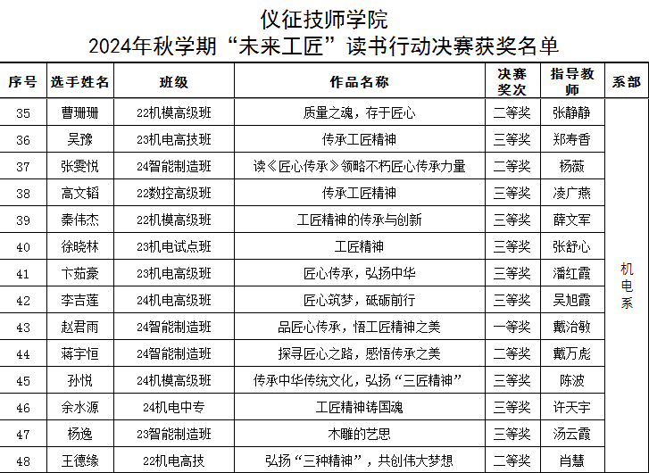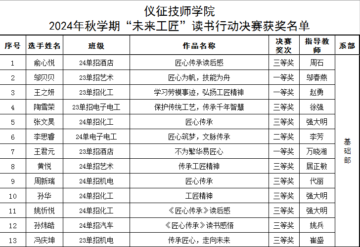 活动期间,各系部以班级为单位,利用晨读及班会课组织学生开展阅读、诵读,展现了阅读的魅力和力量。同学们纷纷表示,通过阅读,不仅拓宽了眼界,增长了知识,还激发了追求工匠精神的热情。在成果汇报环节,同学们积极撰写读书心得和感悟,展示了在阅读中获得的成长和进步。经过系部初赛和学院决赛,最终评选出一等奖14名,二等奖20名,三等奖34名。