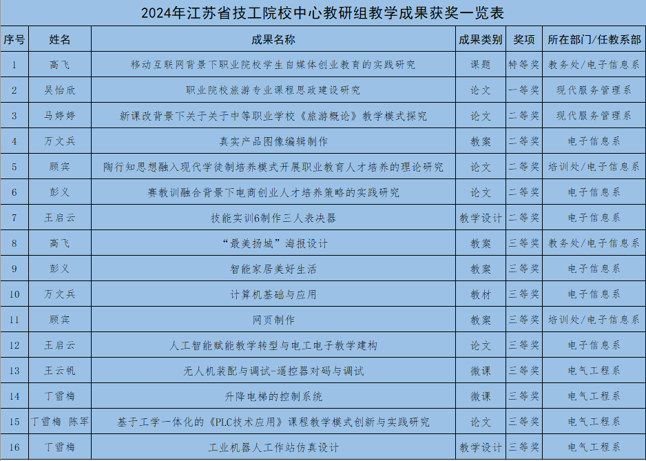 近日,江苏省技工院校电工电子、计算机信息、商贸服务中心教研组2024年度教科研成果评比结果揭晓,学院共有16项成果获奖。