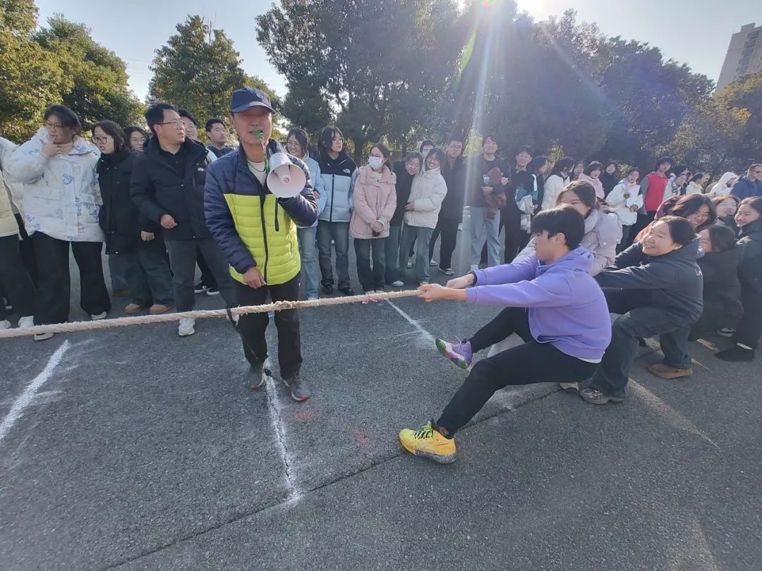 基础部的老师们个个目光坚毅、身体后倾,双手像钳子般紧紧握住粗绳,脚底似生了根,拼命往后拽。站在两侧的拉拉队为各自队伍摇旗呐喊、加油助威,现场掌声、呐喊声、欢呼声此起彼伏,响彻云霄。在一场场激烈对抗中,全场气氛一次次达到高潮。