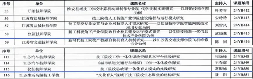 在2024年江苏省技工院校教研课题立项评审中,教务处处长葛振娣主持的《技工院校思政课一体化育人模式的实践研究》、电子信息系副主任武晓燕主持的《新工科视角下产业学院政行企校共建及运行模式研究—以仪征技师新一代信息技术产业学院为例》获准立项。
