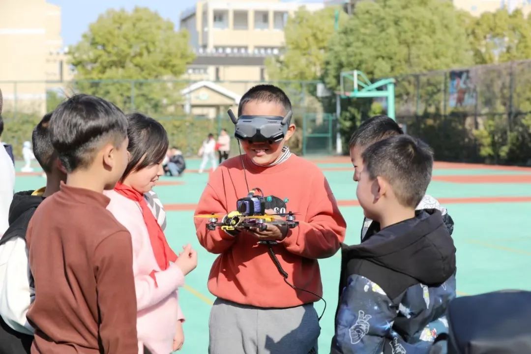 在无人机VR体验区,学生们戴上VR设备,仿佛坐上了无人机,跟随无人机的视角“飞”过山川河流、穿梭在高楼大厦之间,感受着第一人称视角下的高空飞行体验。
