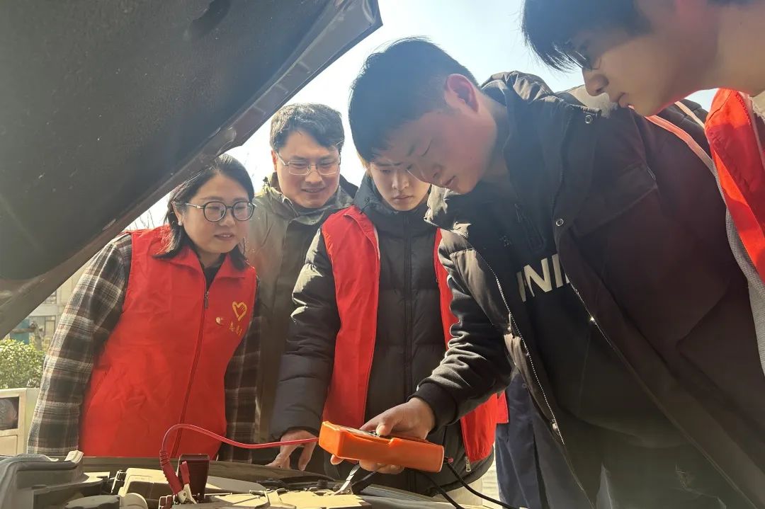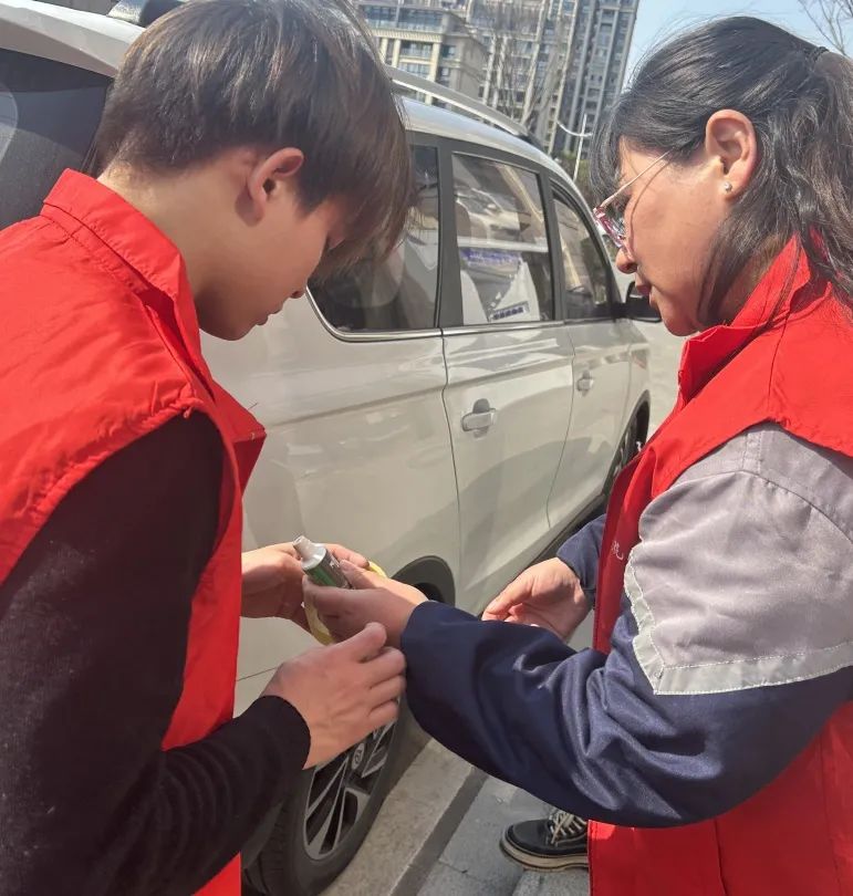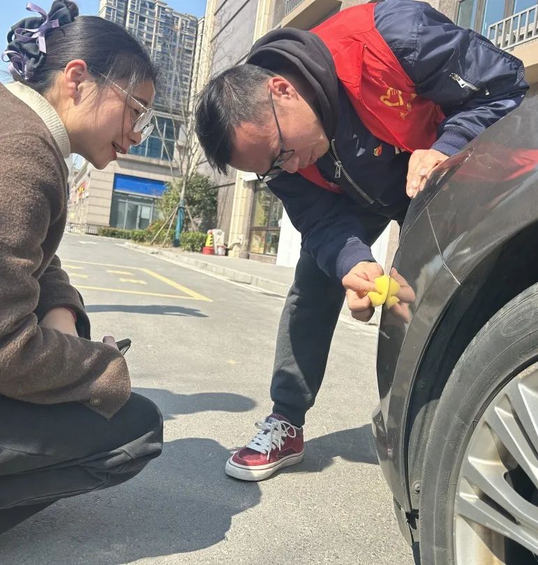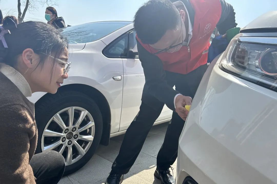 在汽车检测保养区,党员教师们用专业车辆检测设备为车主排除电控隐患,同时用电池检测仪、胎压检测仪等为车辆启动和安全行驶进行保障性检测。学生志愿者仔细检查车辆外观,不放过车身、车灯、后视镜的任何细微损坏,使用快速划痕修复用品为居民爱车内、外饰进行划痕修复。过程中,党员教师与居民进行深入交谈,为他们解答用车疑惑以及车辆养护技巧。
