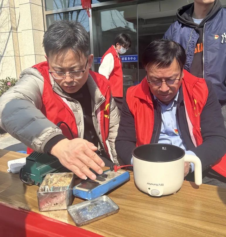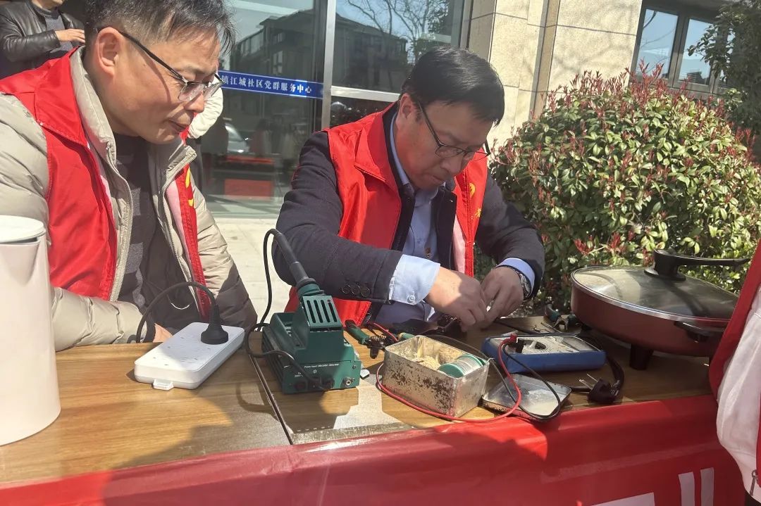 家电维修区同样忙碌,面对居民送来的故障家电,党员教师凭借扎实专业知识,迅速判断问题,熟练更换零件、排查电路,为居民解决实际困难。
