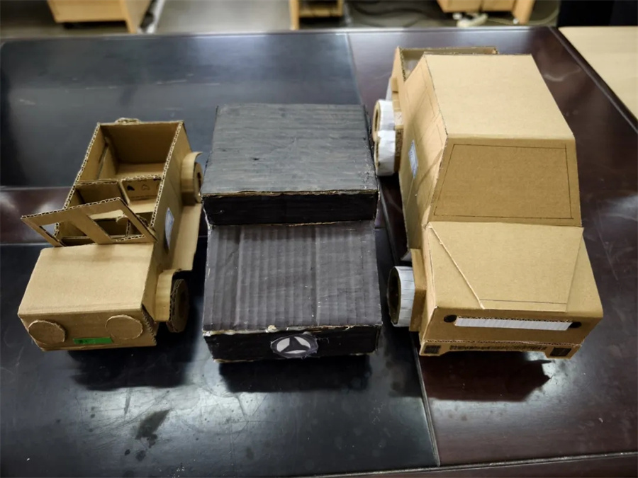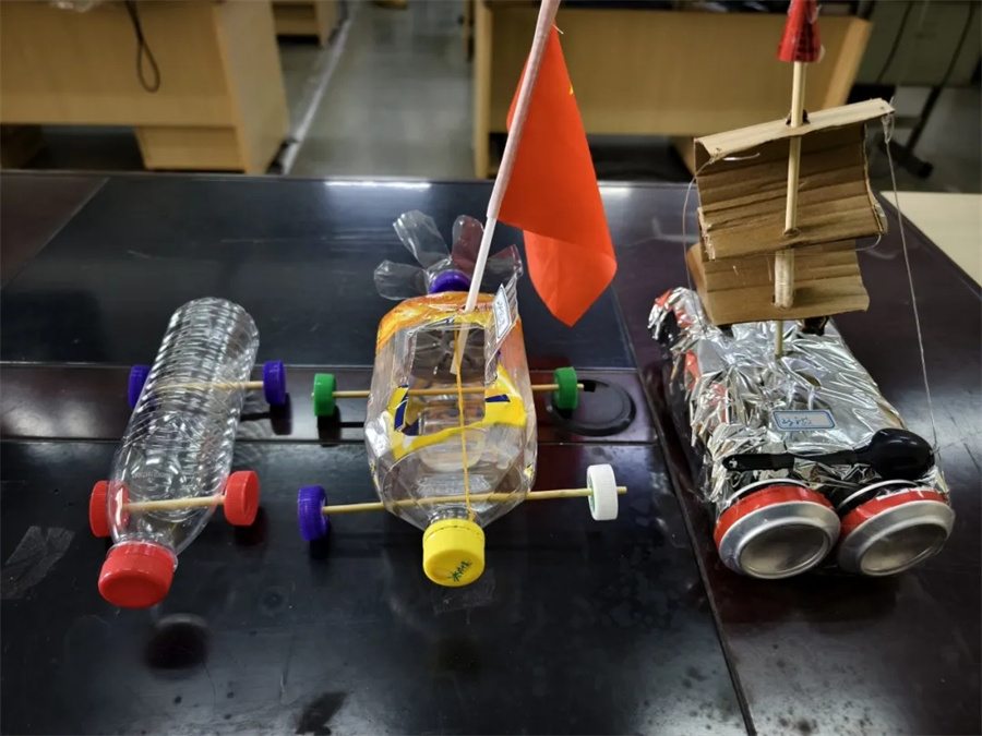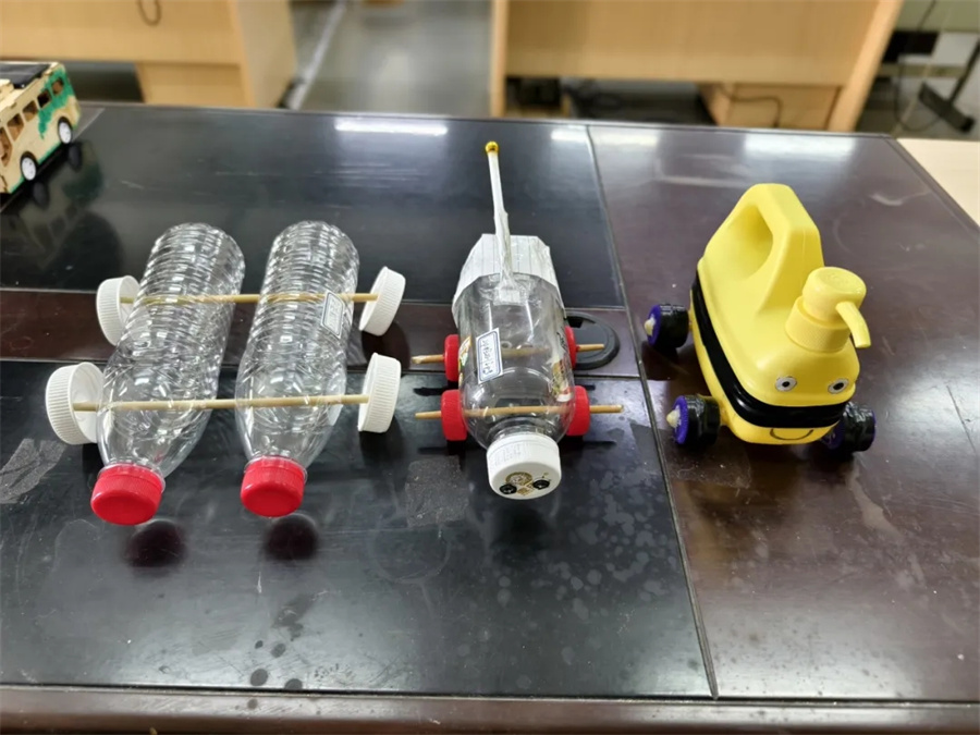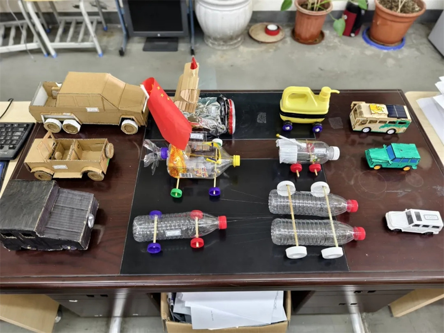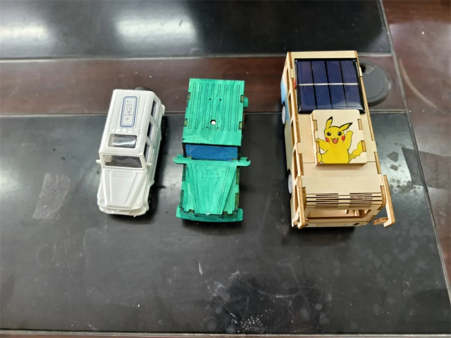 活动现场,学生们以日常生活中的废弃物为原料,通过巧妙构思与精细加工,将看似普通的材料转化为别具一格的“未来座驾”。有的用瓦楞纸板搭建流线型车身,设计出“纸箱超跑”;有的以饮料瓶为基体,制作出单厢和双厢小车;有的则利用橡皮筋制作出无碳动力小车,通过弹性势能驱动车辆前行。更有学生结合新能源理念,尝试将太阳能板与废旧电池结合,探索“光能—电能—动能”的能量转化路径。