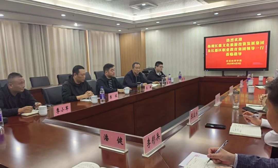 4月9日下午,扬州江淮文旅集团董事长高鹏、江都区职教集团副校长张斌一行莅临仪征技师学院进行考察交流。仪征技师学院党委书记张敏、院长周万春、副院长张友林、后勤保卫处相关负责人及仪征扬子文旅集团相关负责人全程陪同。