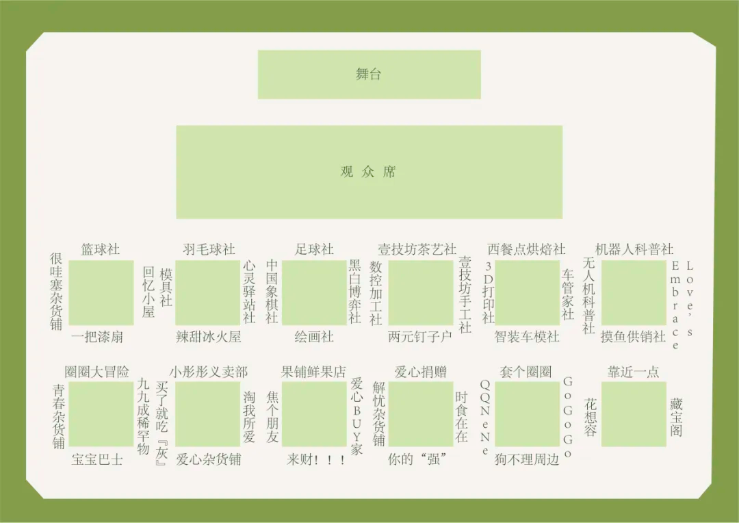 “花young青春”活动热闹开启,现场将呈现6个社团展演节目、15位竞赛歌手精彩对决,18个社团展示摊位与28个师生爱心义卖摊位有序分布,摊位平面图如下。
