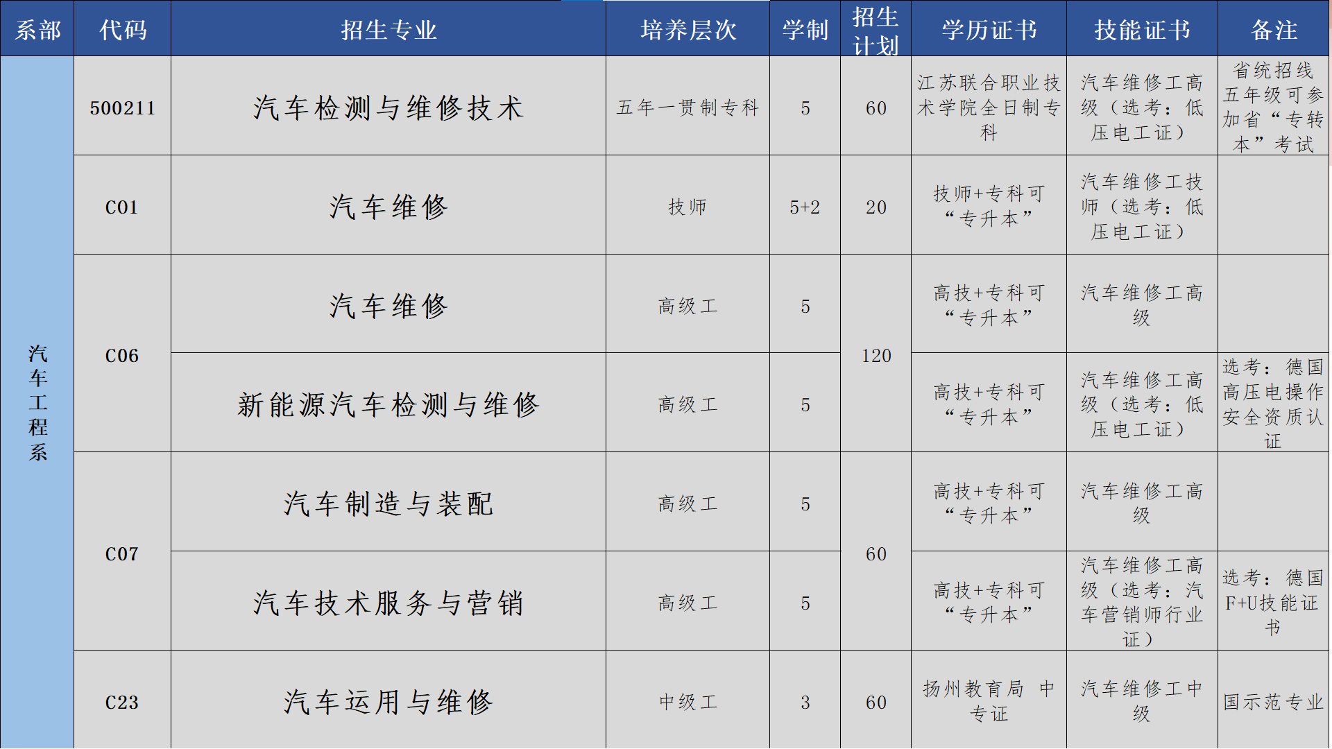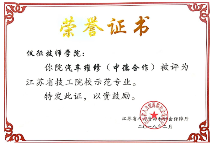 仪征技师学院汽车工程系创办于1985年,汽车专业群由汽车制造与装配技术、汽车运用与维修、汽车检测与维修、汽车营销及技术服务、新能源汽车检测与维修、汽车改装及车身修复、汽车保险理赔与评估等专业方向组成,配备专业群校企负责人,职责分明,运行高效。其中,前四个专业方向均已开办30年以上,招生稳定。拥有“国际HWK考试认证中心”“中德新能源汽车职业能力中心”“全国汽车运用与维修专业紧缺人才培养基地”“国家中等职业教育示范校重点专业”“国家高技能培养培训基地”“江苏省汽车机电技术公共实训基地”“扬州职教集团汽车专业中心牵头校”等荣誉称号。