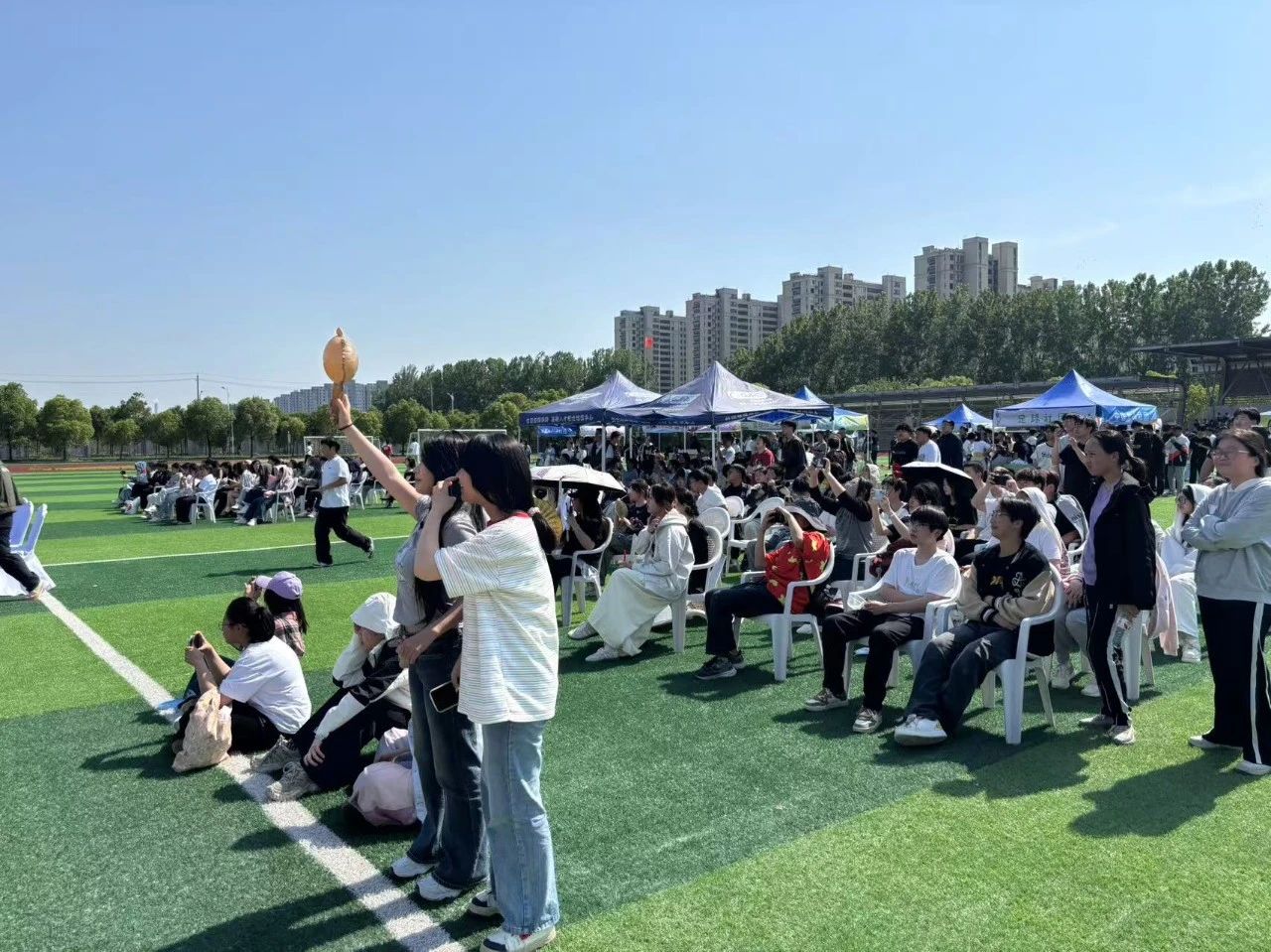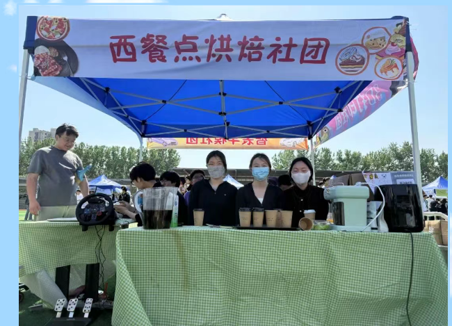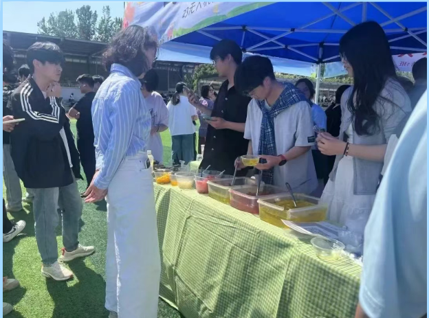 操场后方,社团展示与爱心义卖有序开展。各社团、班级精心布置摊位,篮球社团和足球社团设置的体验项目,吸引众多同学参与。烘焙社自制的奥利奥麦芬、蛋挞、咖啡飘香四溢,班级摊位的手打柠檬茶、面条、扇子、气球等商品琳琅满目。同学们热情高涨,清脆的吆喝声此起彼伏,热闹非凡。