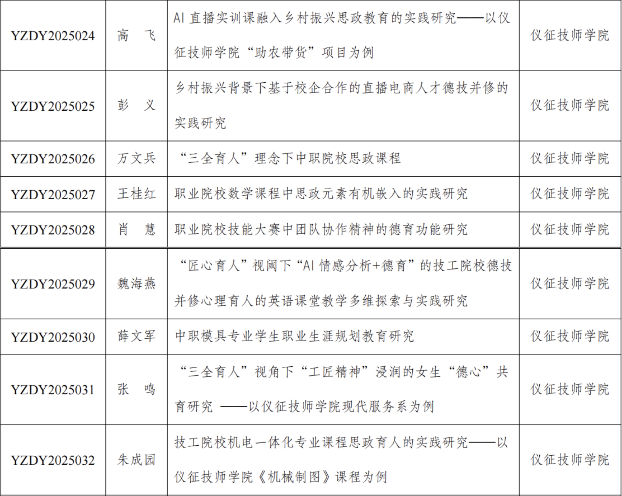 近日,扬州市德育研究会正式公布2025年德育专项课题立项名单,根据《关于在全市职业学校开展2025年德育专项课题研究的通知》要求,仪征技师学院教研室积极组织课题申报。经扬州市德育研究会严格评审,仪征技师学院9项德育课题获批立项。 学院将以课题研究为抓手,推动德育工作与专业教学深度融合,着力培养德智体美劳全面发展的高素质技术技能人才,为区域经济社会发展贡献职教力量。 审核:高飞 通讯员:曹德臣